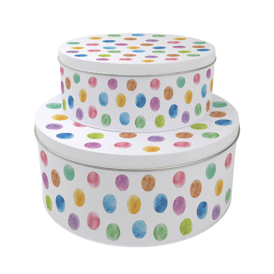Bring the joy of a rainbow into your home with these colourful polka dot print cake tins! Perfect for adding a fun splash of colour to any kitchen, this spotty design would make a lovely gift for friends or family who love to bake. Available individually, or as a mixed set of two.