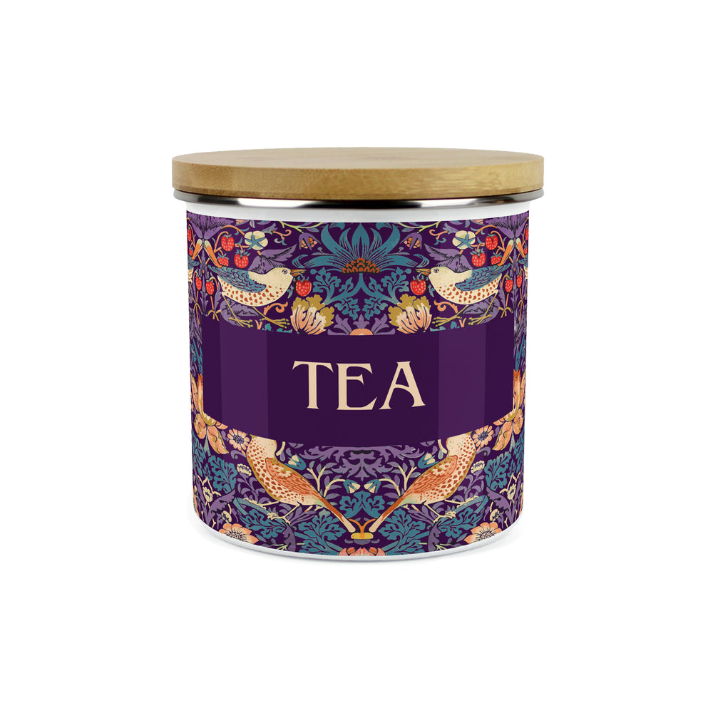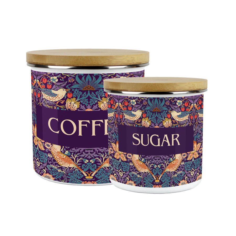 These artistic storage canisters are an unusual yet timeless gift for art lovers! Stylised on the works of famous designer William Morris, featuring a bird print surrounded by foliage and fruits on a royal purple background, they are ideal for storing your hot drinks essentials. Each text option is available in two sizes so that you can choose the best suited size for your kitchen.