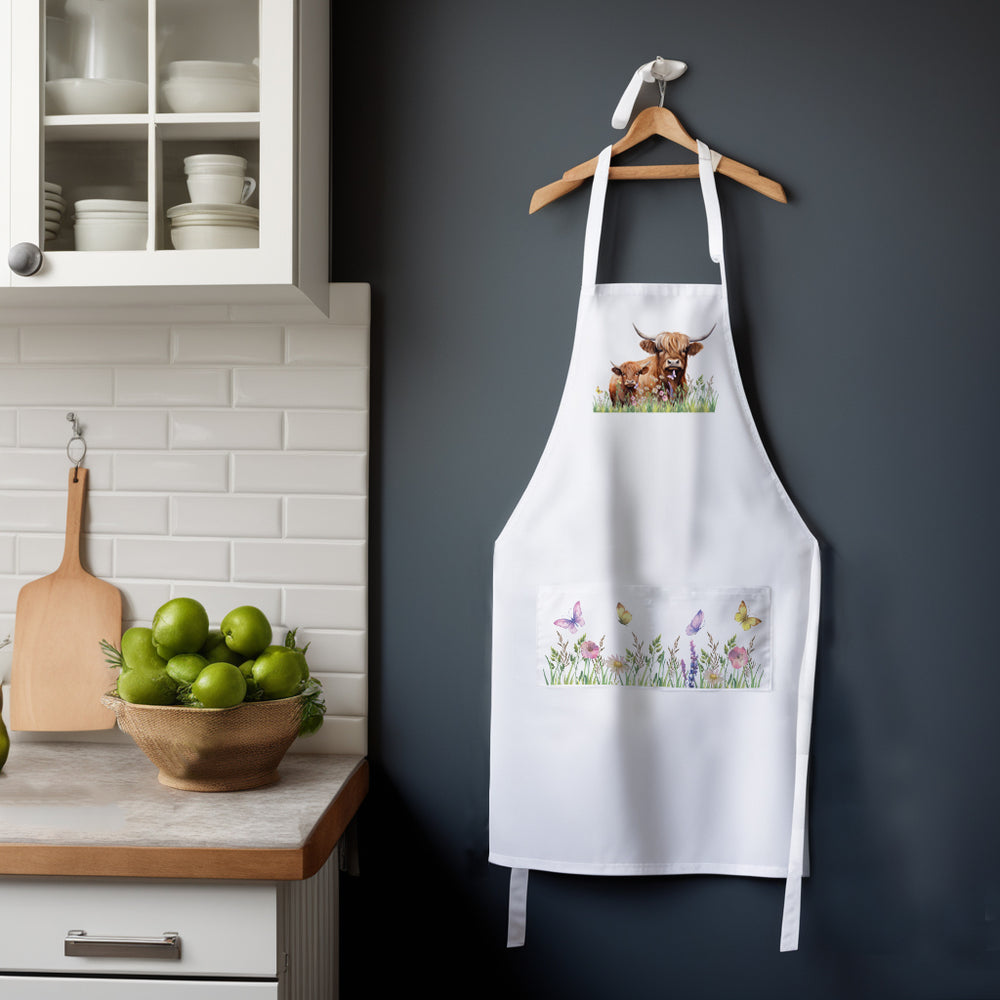 Add a touch of countryside charm to your kitchen with this lovely highland cow apron! With a mum and adorable calf, this apron has a comfortable and adjustable fit and is sure to protect your clothing from spills and splatters when cooking and baking. Perfect as a gift or for everyday use!
