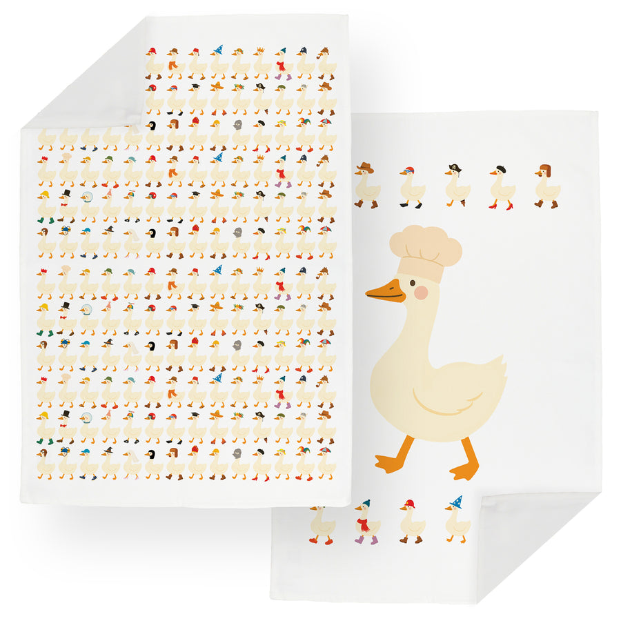 Take a gander through the world of 'Silly Goose' characters with these quirky panama cotton tea towels! Displaying geese themed designs, with each bird dis-goose-d in different outfits and accessories, these kitchen linens are sure to create a fun conversation starter whenever you have guests visiting. A comical gift idea for any occasion, available to purchase as a set or individually.