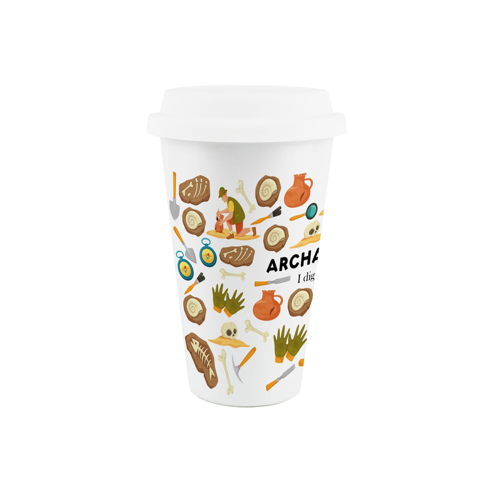 This excavation-themed travel mug is a perfect gift for the archaeologist in your life! Featuring a history and fossil inspired print all around the ceramic flask and the text "Archaeologist - I dig dead things" on the front, this will be sure to make their drinks taste even better during those long days searching through the earth!