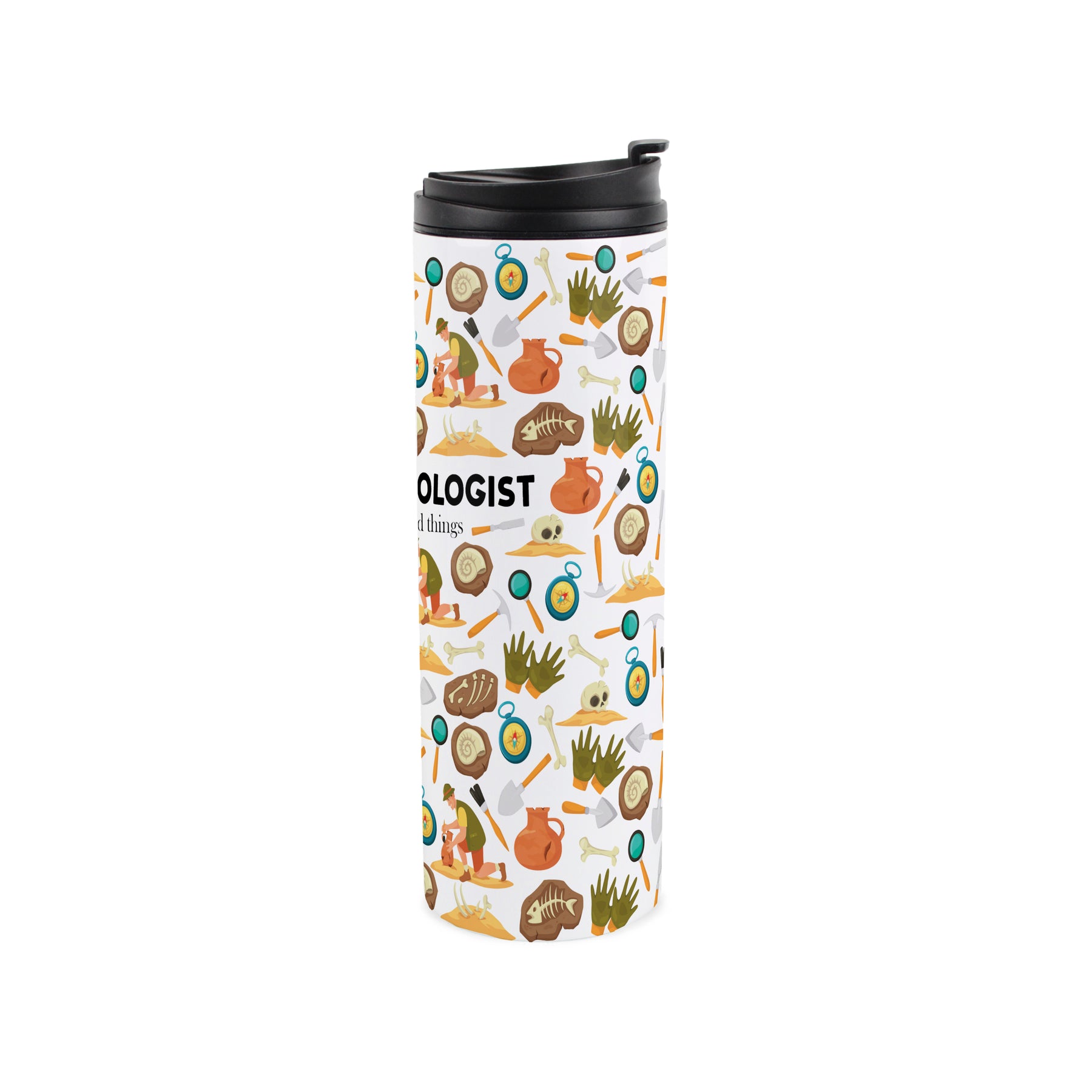 This excavation-themed travel flask is a perfect gift for the archaeologist in your life! Featuring a history and fossil inspired print all around the travel mug and the text "Archaeologist - I dig dead things" on the front, this will be sure to make their drinks taste even better during those long days searching through the earth!