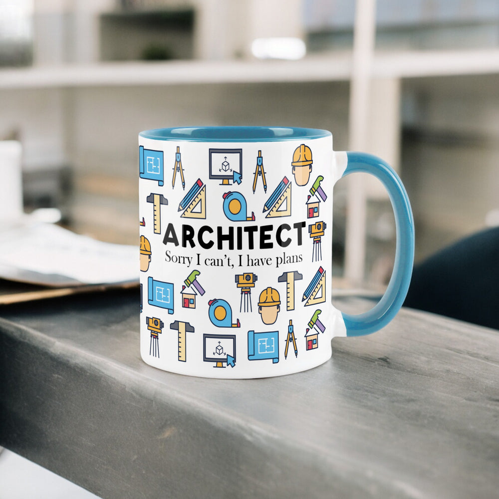This architecture-themed mug is a perfect gift for the architect in your life! Featuring a print filled with a range of calculation and measuring equipment all around the mug and the text "Architect - Sorry I can't, I have plans" on the front, this will be sure to make their hot drinks taste even better while they plan and design their next big project!