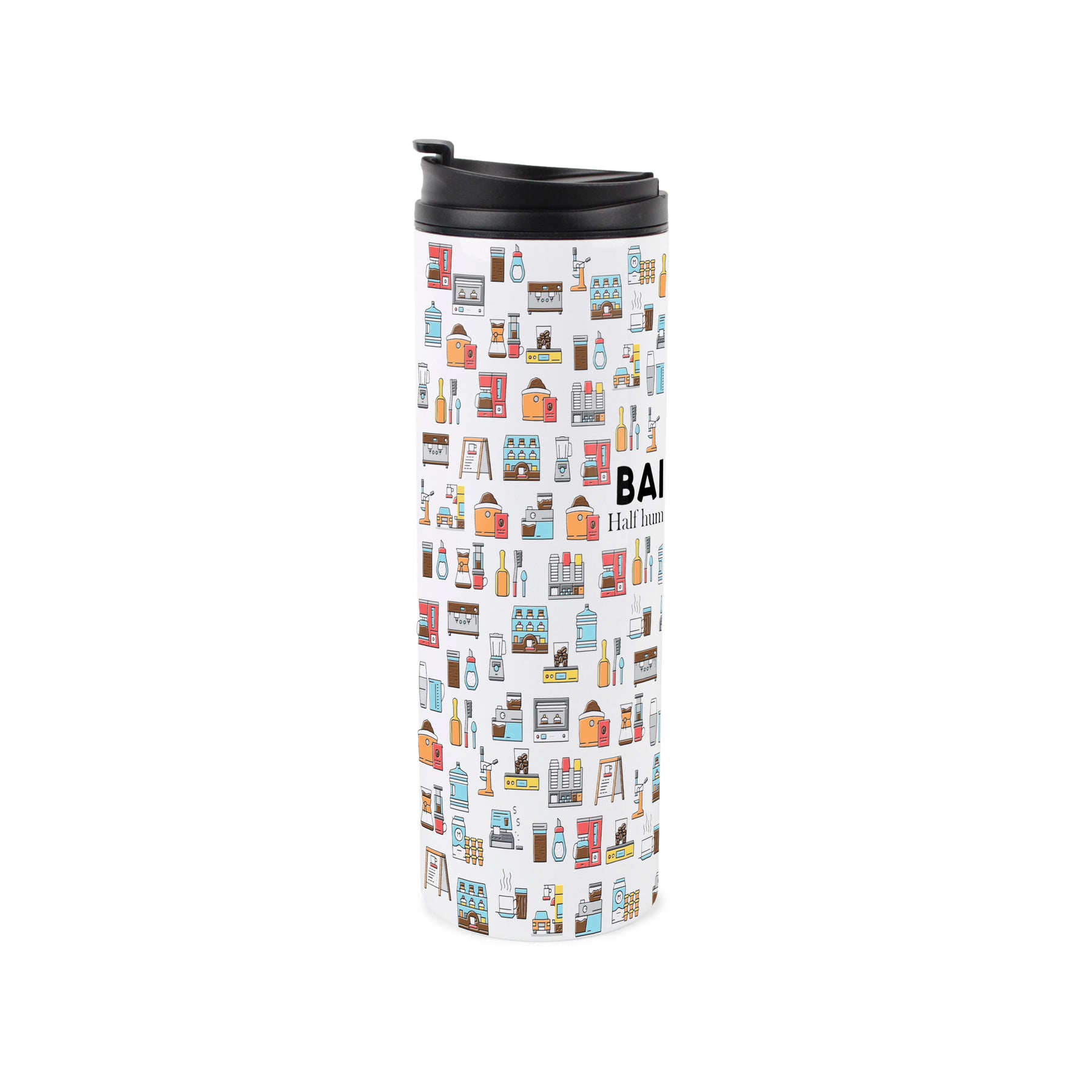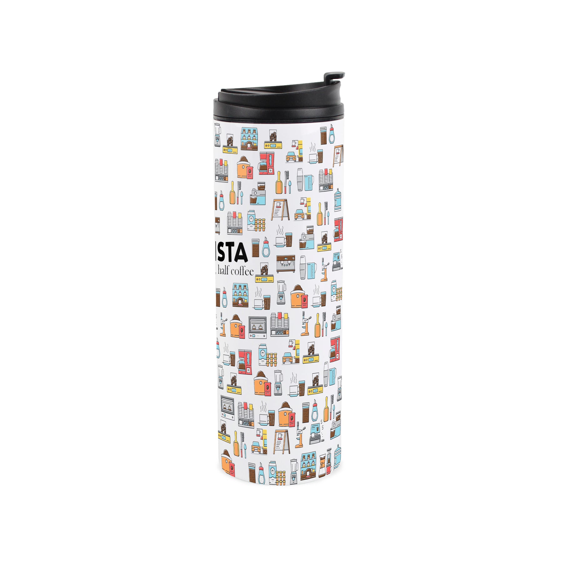 This coffee-themed travel flask is a perfect gift for the barista in your life! Featuring a coffee shop inspired print all around the travel mug and the text "Barista - Half human, half coffee" on the front, this will be sure to make them enjoy their freshly brewed coffee - even if it is their sixth cup of the day! Ideal for gifting to family and friends in the trade.