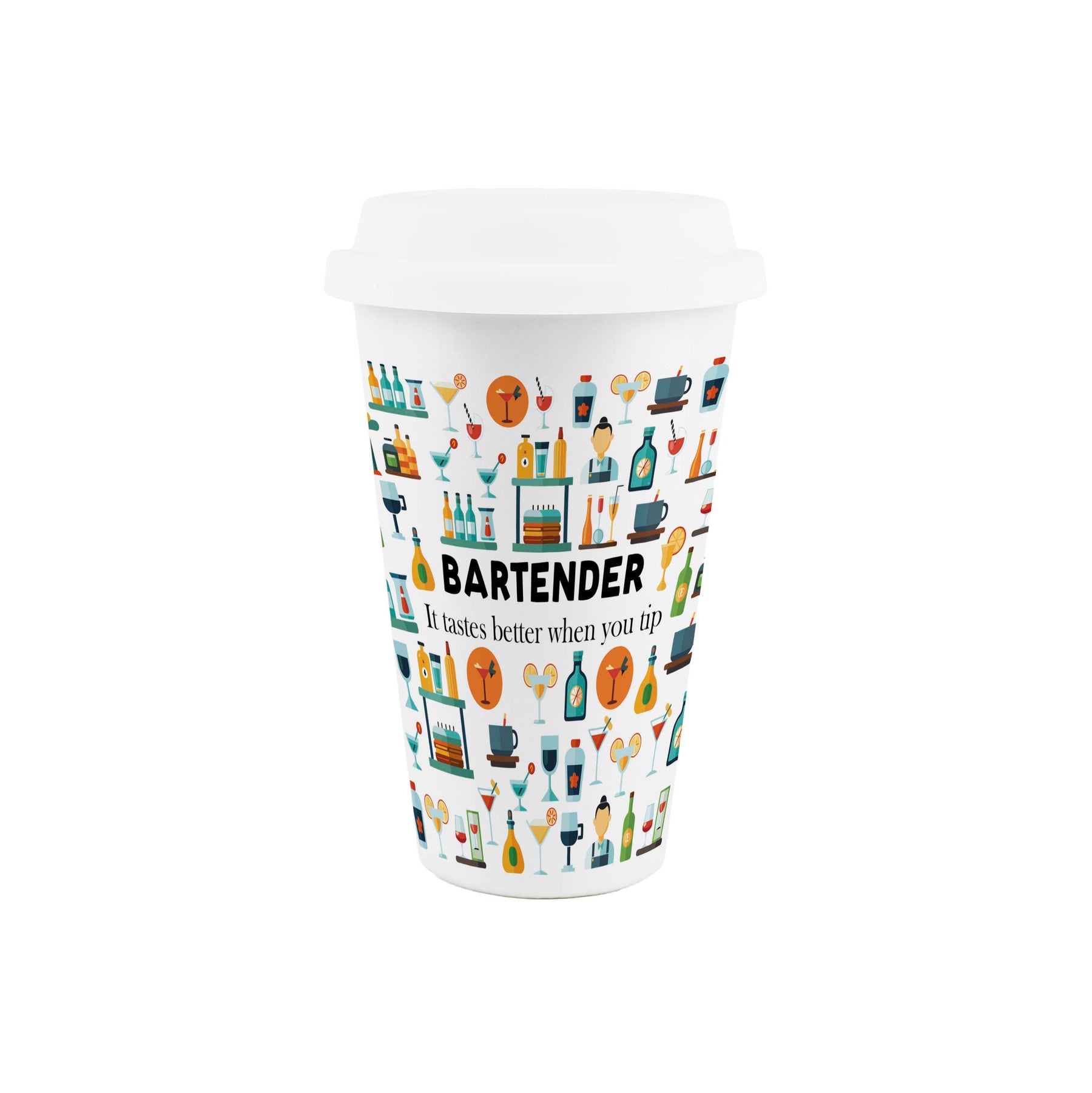This comical white ceramic travel mug is a perfect gift for any bartender in your life. Featuring a range of drinks illustrations, ranging from a glass of wine to a citrus cocktail, partnered with text quoting "Bartender - It tastes better when you tip" on the front. The only question left to ask is, would you like you drink shaken or stirred?