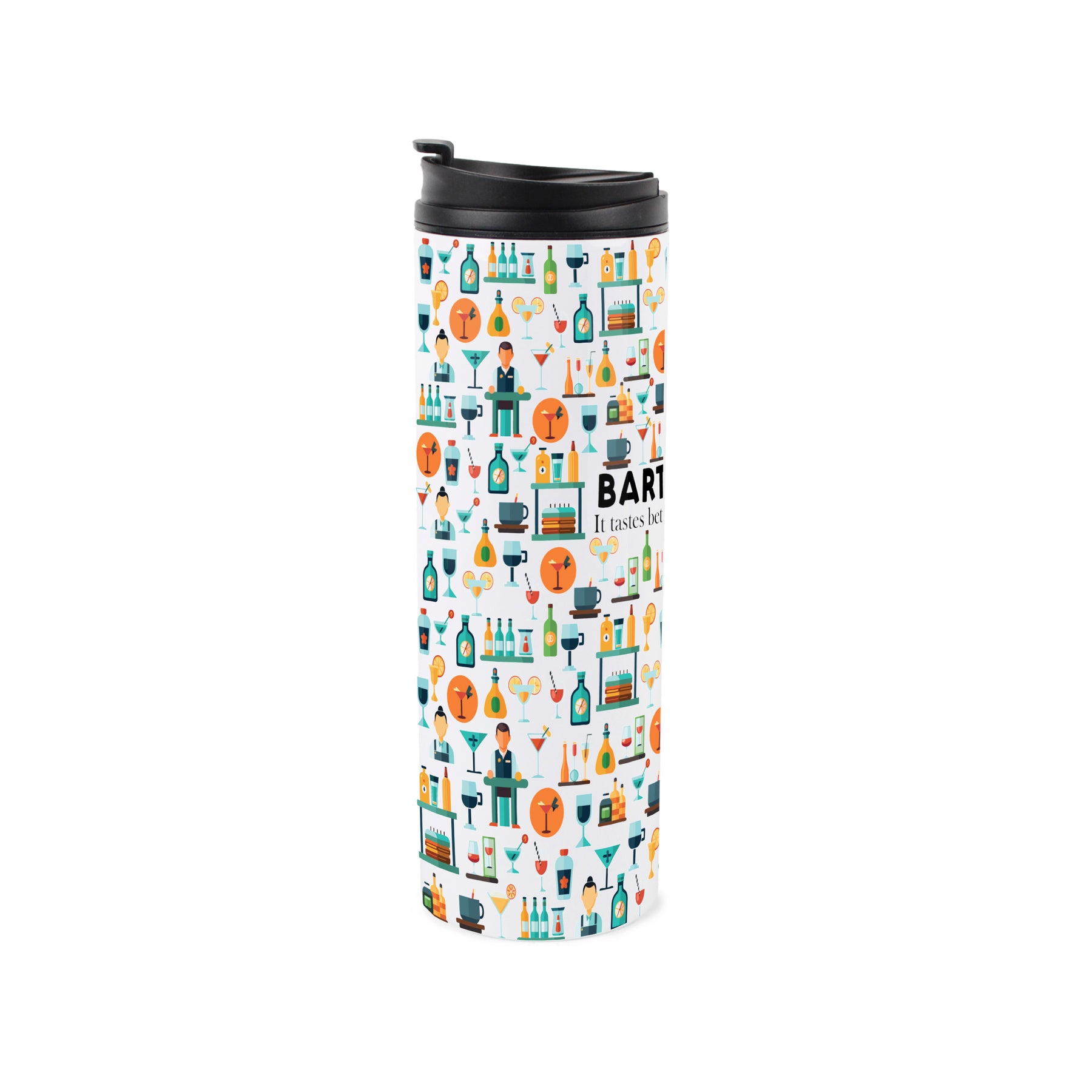 This comical stainless steel travel flask is a perfect gift for any bartender in your life. Featuring a range of drinks illustrations, ranging from a glass of wine to a citrus cocktail, partnered with text quoting "Bartender - It tastes better when you tip" on the front. The only question left to ask is, would you like you drink shaken or stirred?