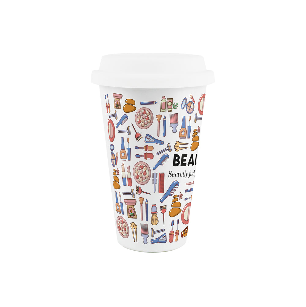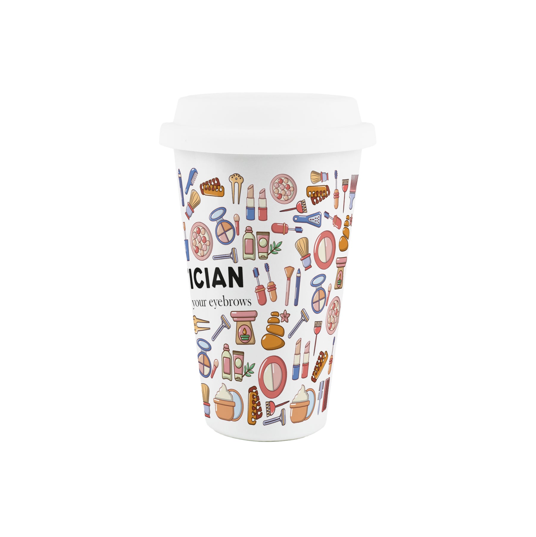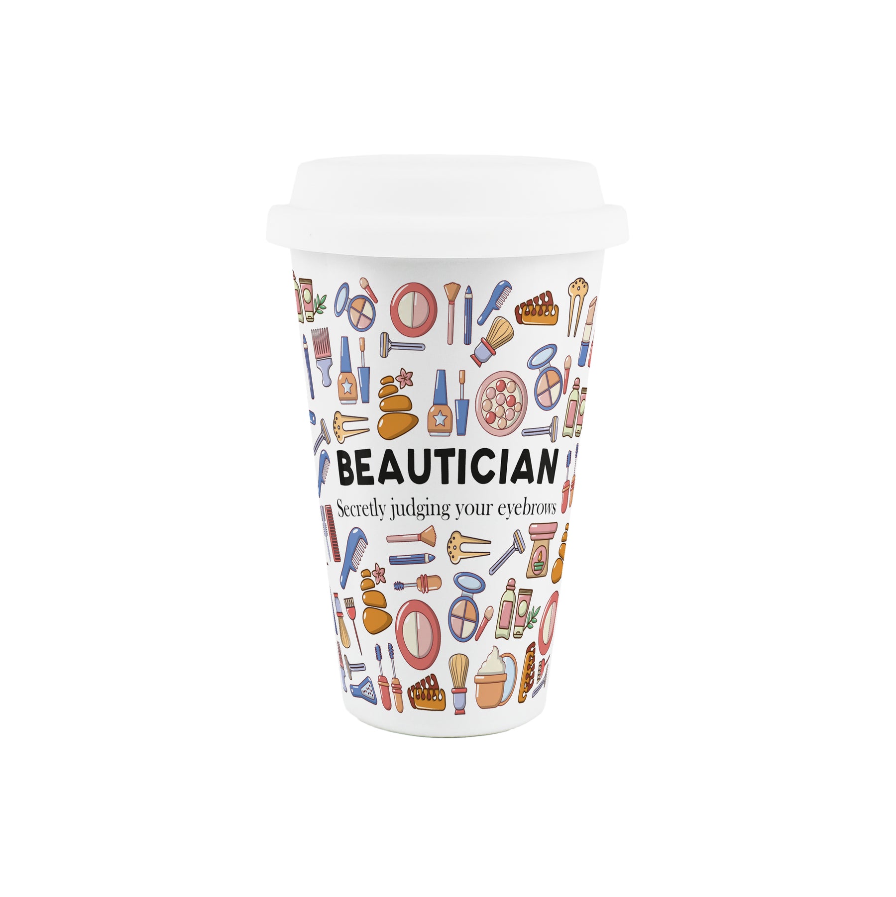 This makeup-themed ceramic travel mug is a perfect gift for the beautician in your life! Featuring a print filled with beauty products all around the porcelain flask and the text "Beautician - Secretly judging your eyebrows" on the front, this will be sure to make those hot drinks taste even better while they work their magic and create a masterpiece with makeup!