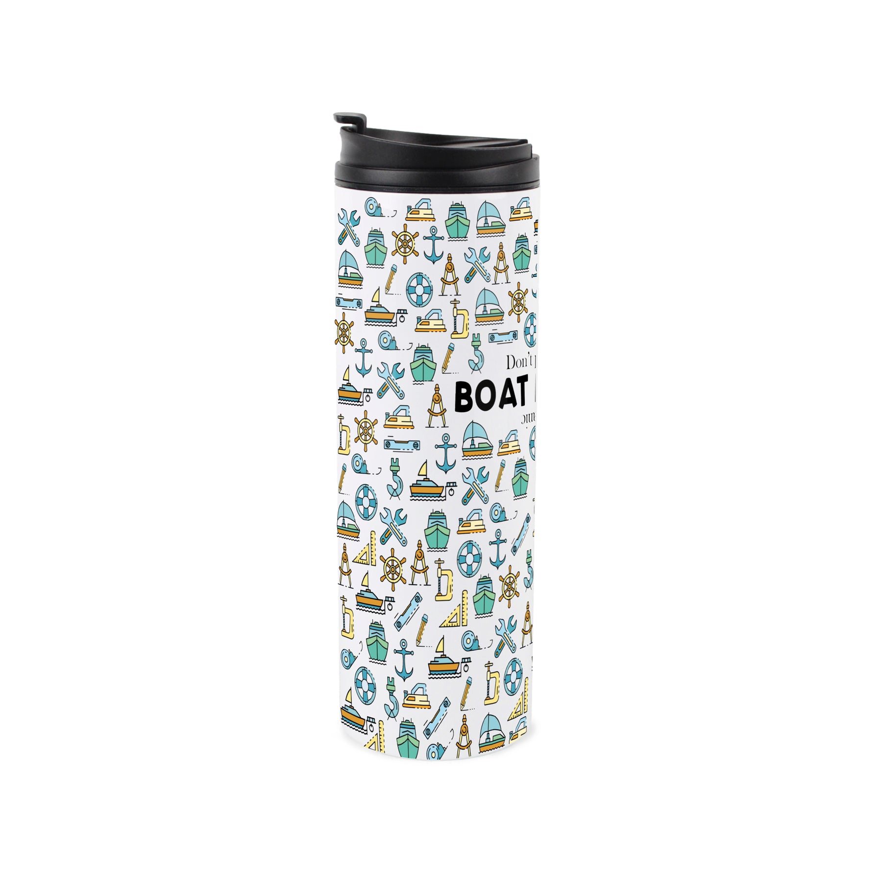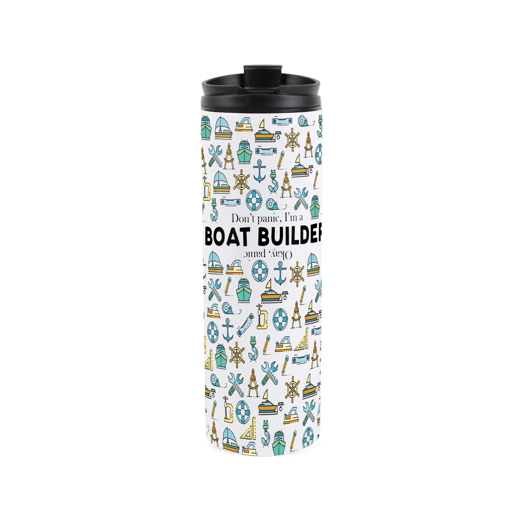 This trade-themed stainless steel travel flask is a perfect gift for the boat builder in your life! Featuring a fun marina inspired print all around the tumbler and a fun "Don't panic" quote on the front, this will be sure to make those hot (or cold) drinks taste even better during those long days of building and fixing boats.