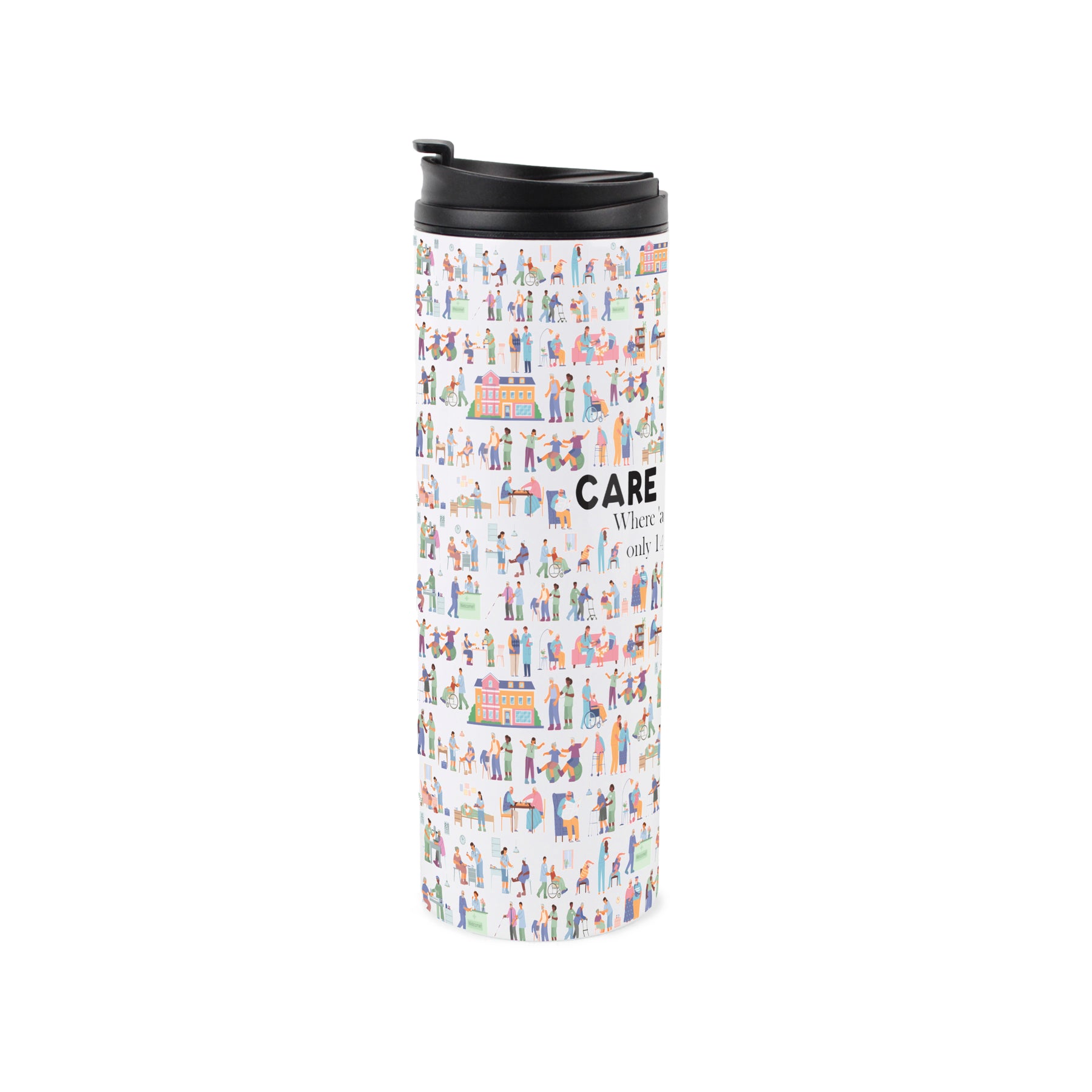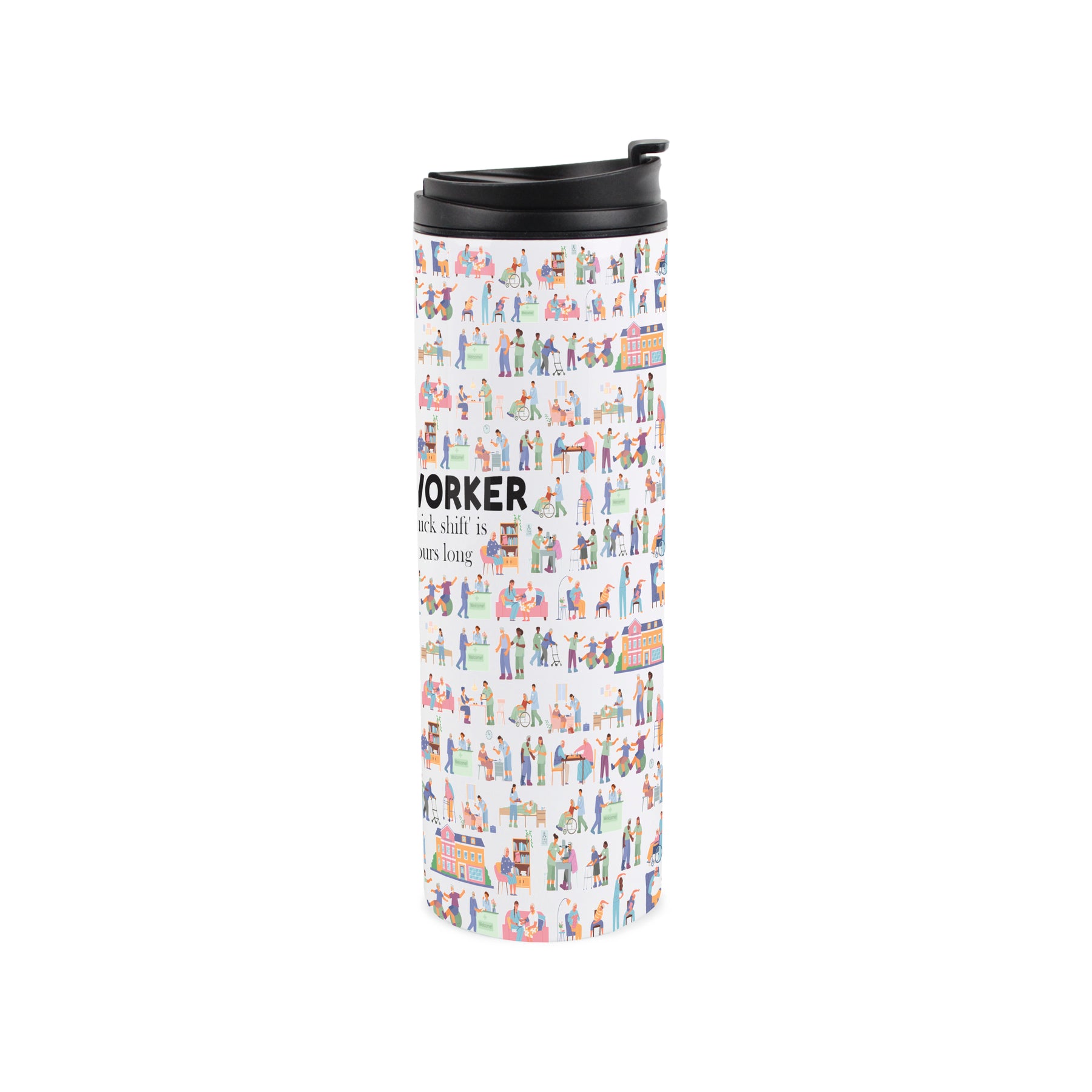 This humorous travel flask is a perfect gift any care worker you know! Featuring a range of illustrations relating to a day in the job all around the tumbler and the text "Care Worker - Where 'a quick shift' is only 14 hours long" on the front, this will be sure to become their go-to choice every time they are making a hot drink for the journey to work!