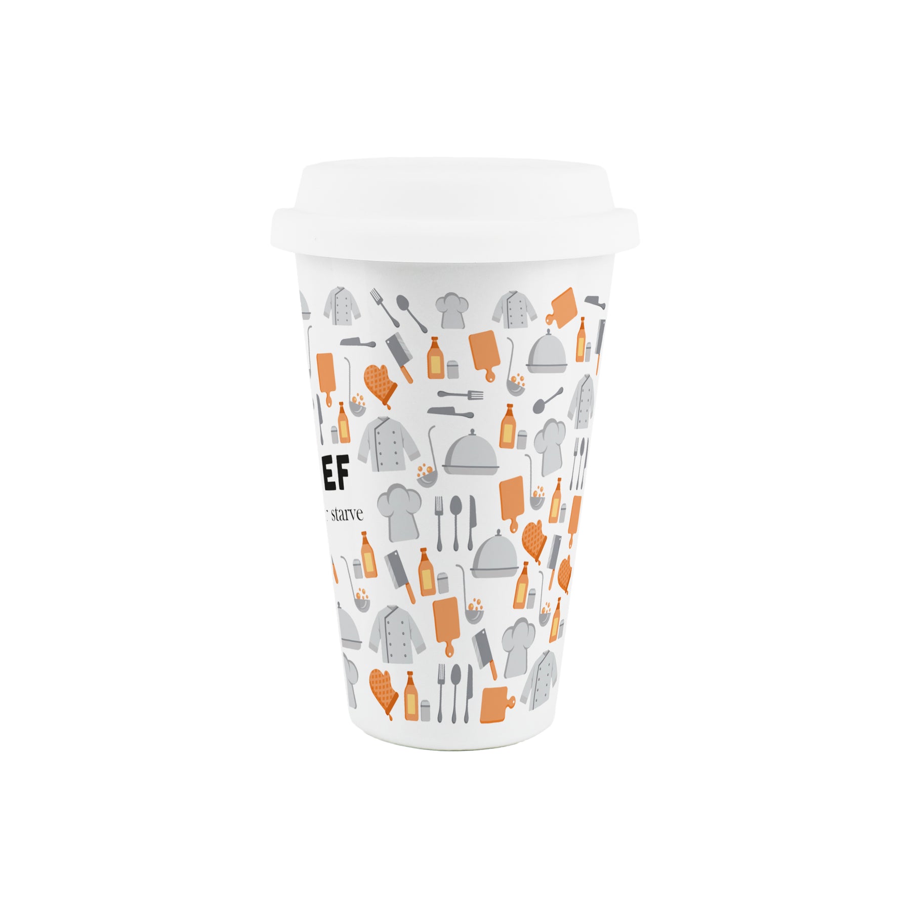 This cooking-themed ceramic travel flask is a perfect gift for the chef in your life! Featuring a fun kitchen inspired print all around the porcelain mug and the text "Chef - Eat it or starve" on the front, this will be sure to resonate with any chef who has had previous experience with cooking for difficult customers! Perfect as a gift for yourself or for friends in the trade.