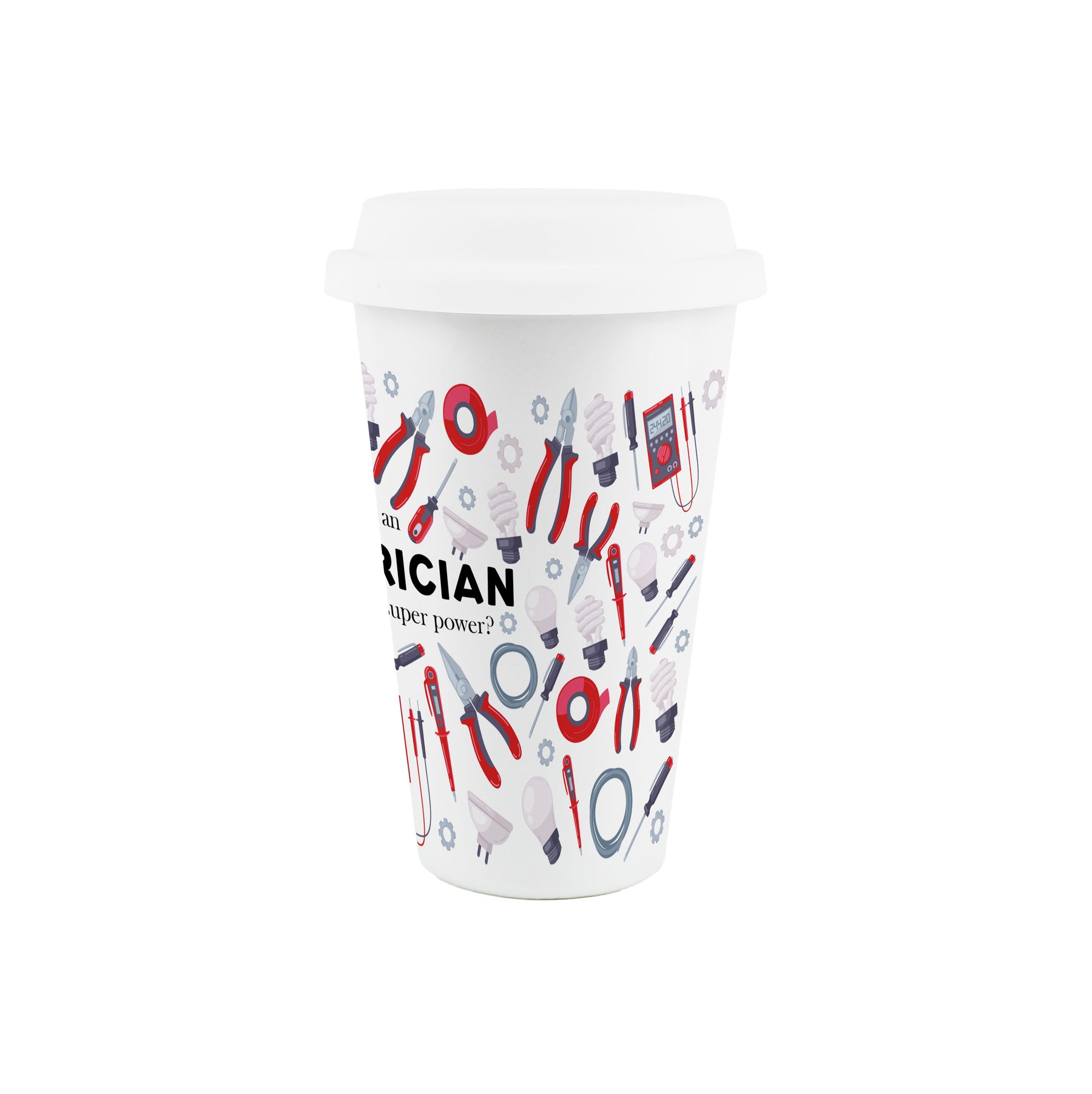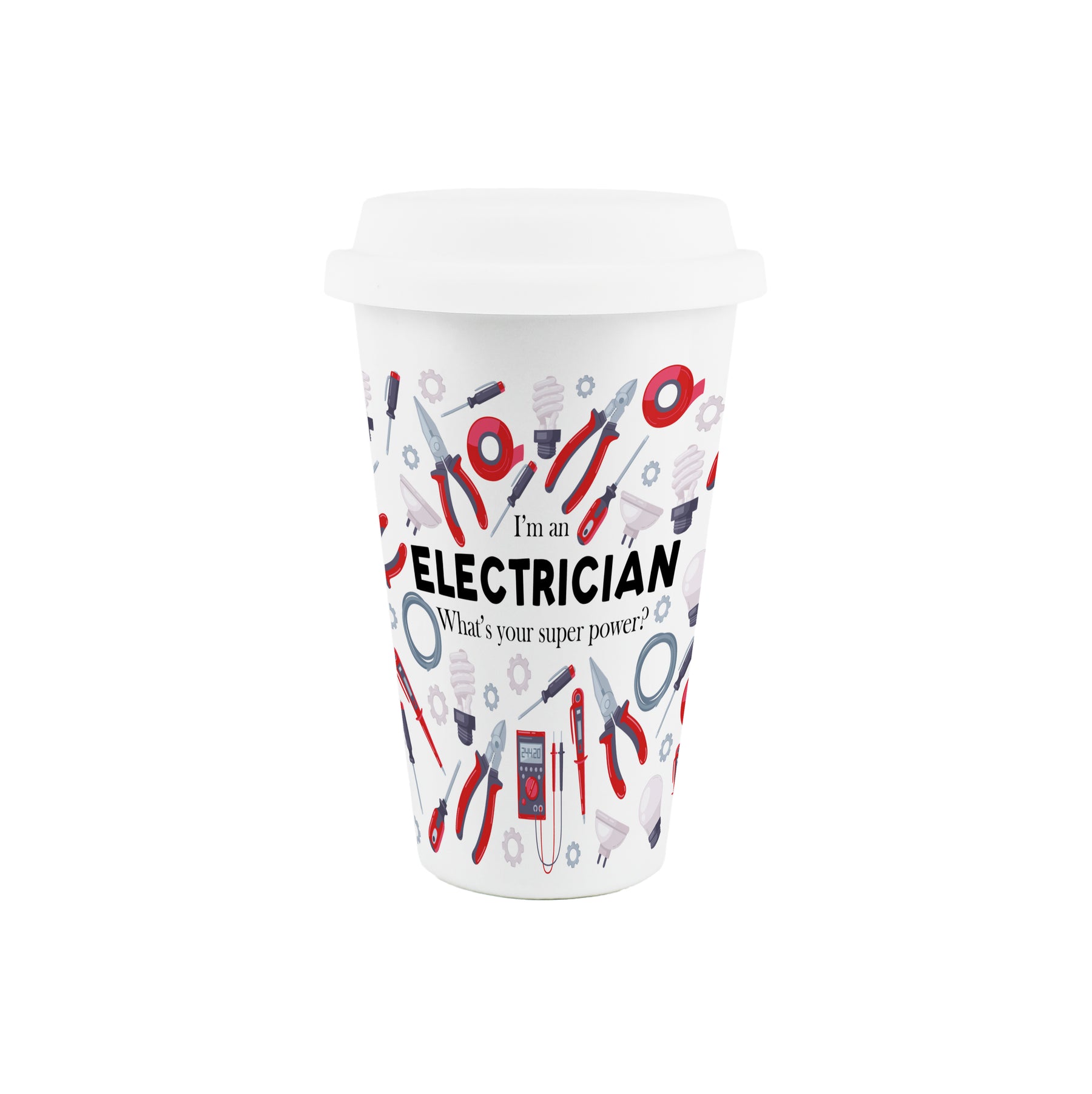 This humorous ceramic travel mug is a perfect gift for any electrician in your life. Featuring a print filled with illustrations relating to the day-to-day life of a 'Sparky' around the mug, partnered with text quoting "I'm an Electrician - What's your super power?" on the front, this will be sure to make their hot drinks taste even better, while giving them a chuckle between jobs!