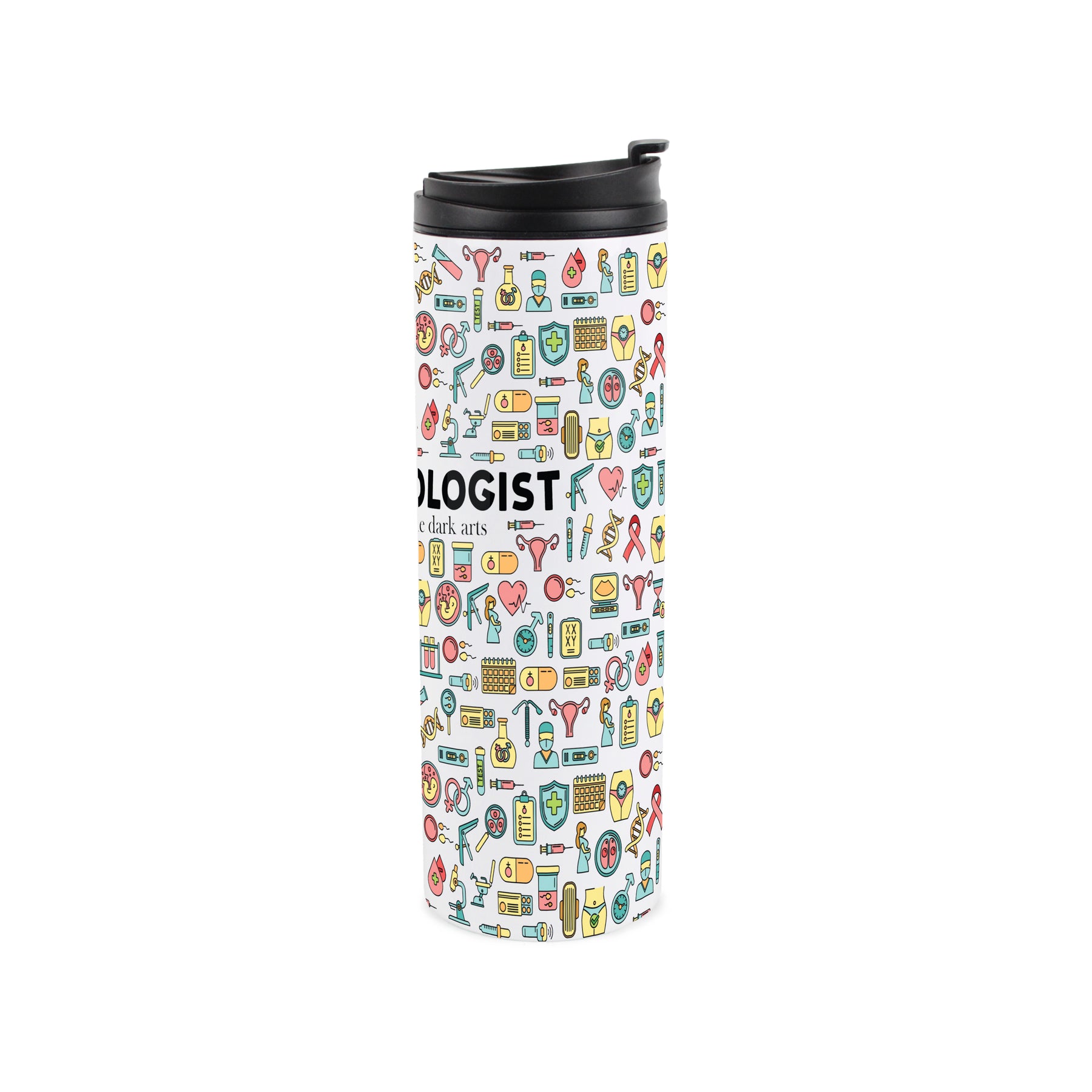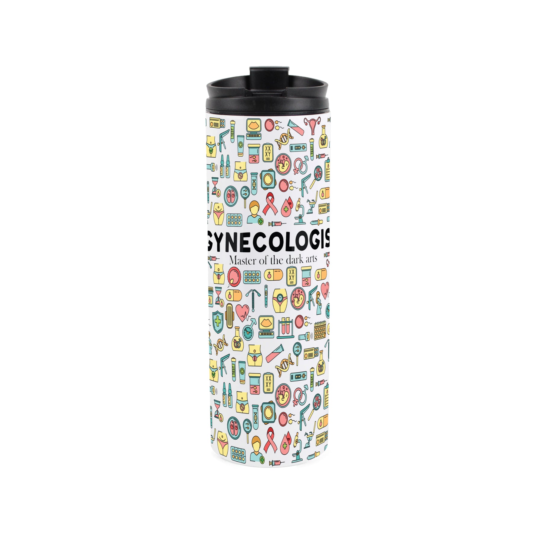 This comical stainless steel travel flask is a perfect gift for the gynecologist in your life. Featuring a medical-themed print, partnered with text quoting "Gynecologist - Master of the dark arts" on the front, this will be sure to be their tumbler of choice when they get the moment for a tea break, and give them a chuckle between patients!