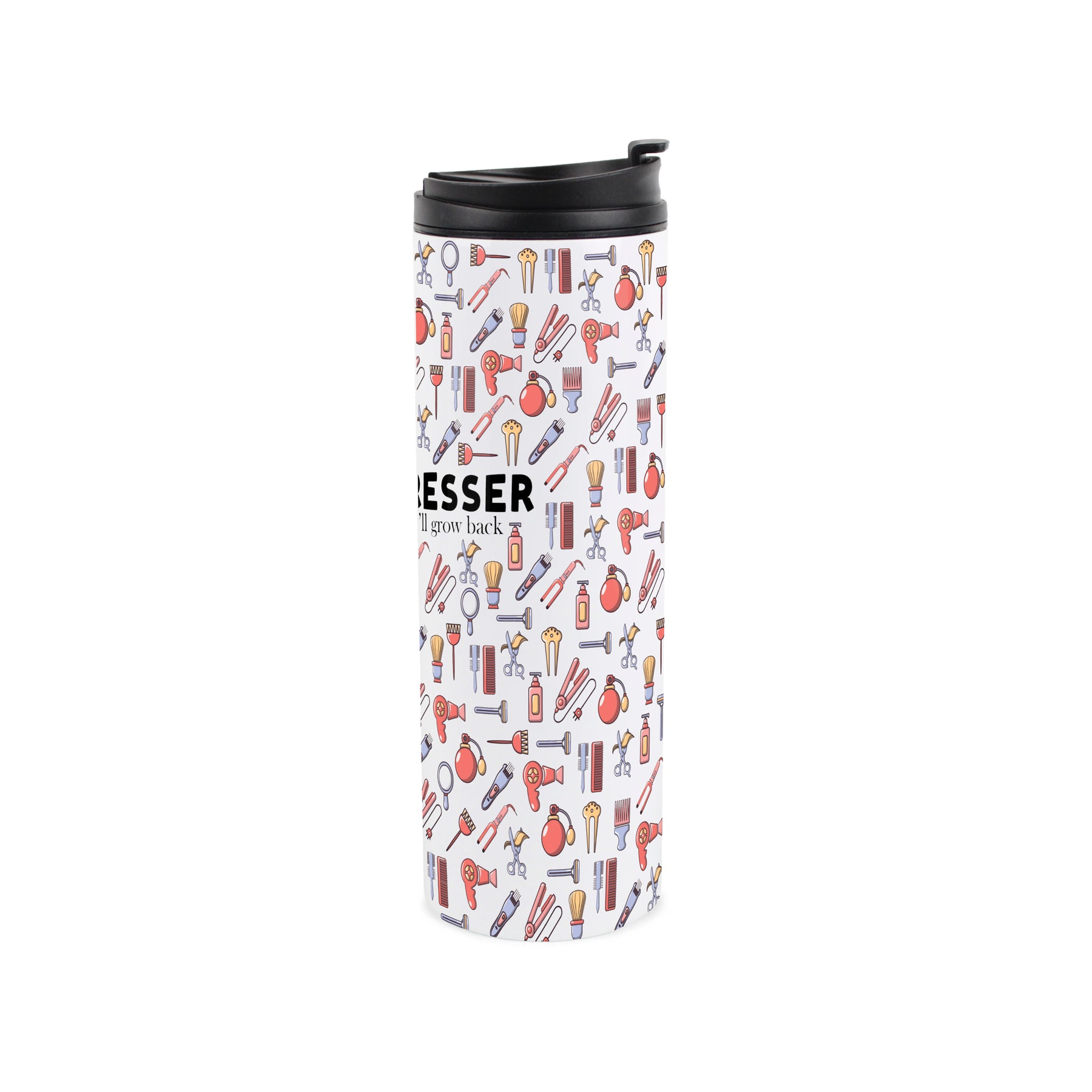This stylist-themed travel flask is a perfect gift for the hairdresser in your life! Featuring a print filled with hair-styling related products all around the travel mug and the text "Hairdresser - Don't worry, it'll grow back" on the front, this will be sure to make those hot drinks taste even better during those long days in the salon, as well as giving them a chuckle while they work! Ideal for gifting to family or for friends in the trade.