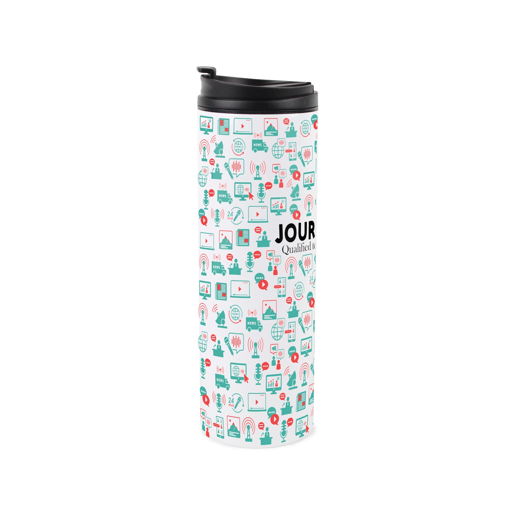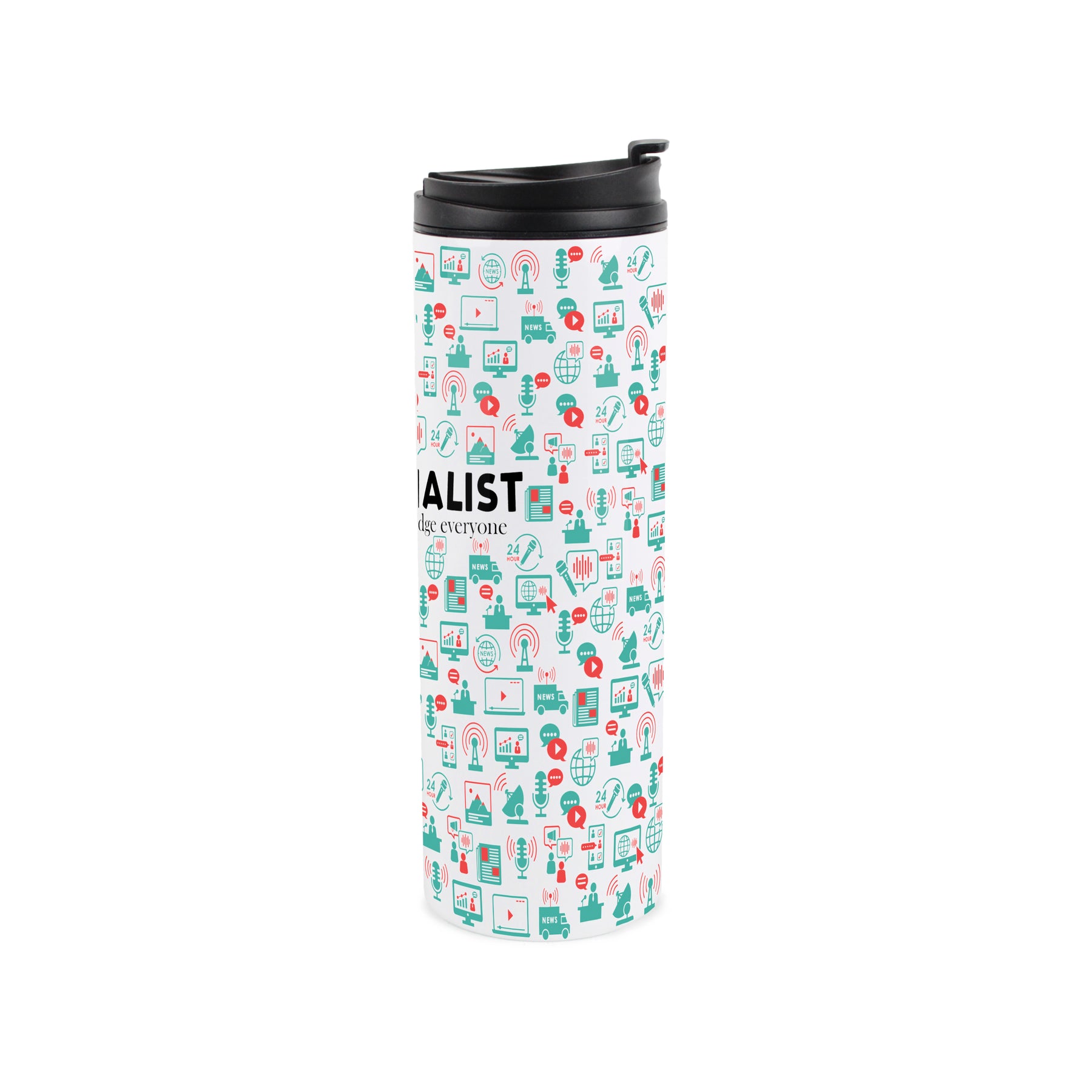 This media-themed travel flask is a perfect gift for the journalist in your life! Featuring a fun interviewing inspired print all around the travel mug and the text "Journalist - Qualified to judge everyone" on the front, this will be sure to make those hot drinks taste even better during those long days of questioning to find out the next big story! Ideal for gifting to family and friends in the trade.