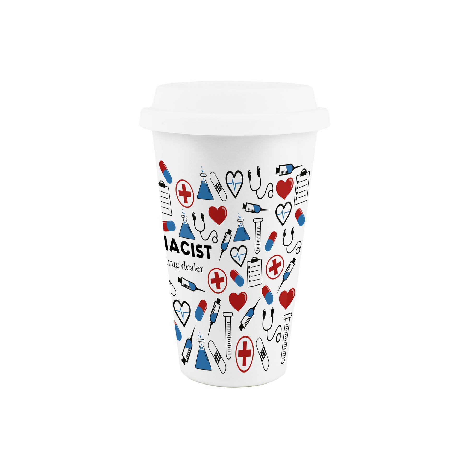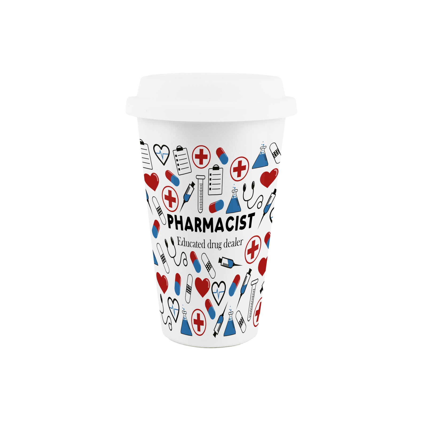 This pharmacy-themed ceramic travel mug is a perfect gift for any pharmacist in your life! Featuring a print filled with medical related equipment around the mug and the humorous phrase "Pharmacist - Educated drug dealer" on the front, this will be sure to make their hot drinks taste even better!