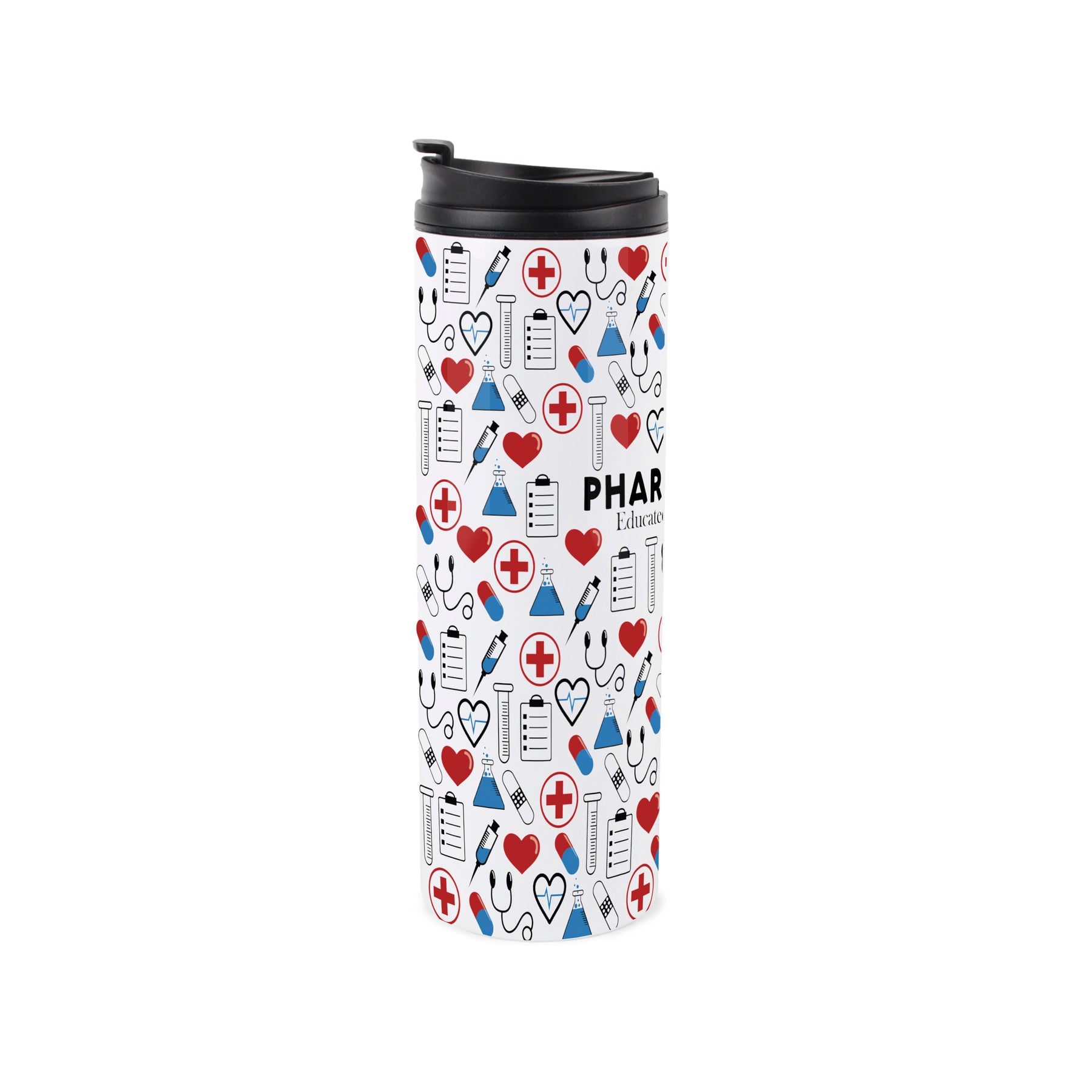 This pharmacy-themed stainless steel travel flask is a perfect gift for any pharmacist in your life! Featuring a print filled with medical related equipment around the tumbler and the humorous phrase "Pharmacist - Educated drug dealer" on the front, this will be sure to make their hot drinks taste even better!