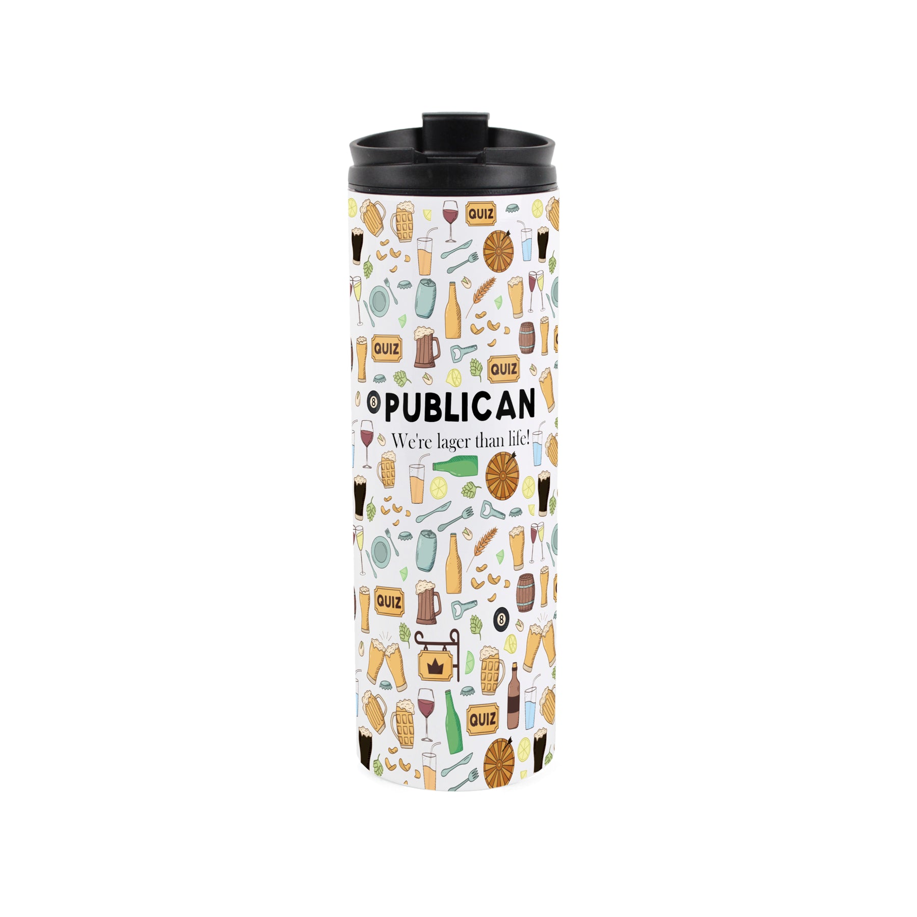 This bar themed stainless-steel flask is a perfect gift for any publican in your life. Featuring a print filled with drinks, bar snacks, dart boards and more around the tumbler, partnered with comical text quoting "Publican - We're lager than life!" on the front, this will be sure to make them smile between pouring pints and clearing tables!