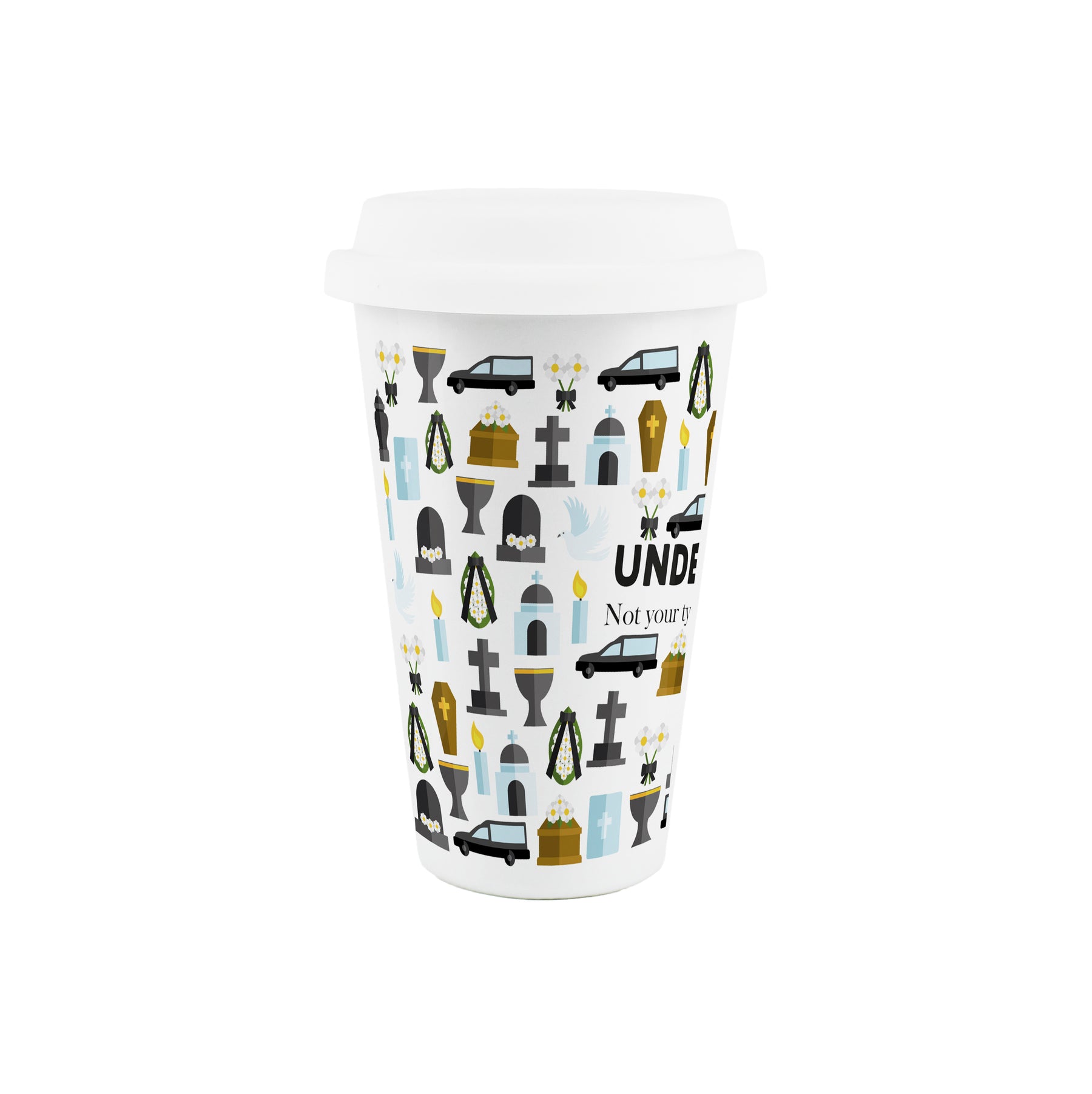 This death-themed porcelain travel mug is a perfect gift for the undertaker in your life! Featuring a funeral inspired print all around the ceramic cup and the text "Undertaker - Not your typical dead-end job" on the front, this will be sure to make their drinks taste even better!