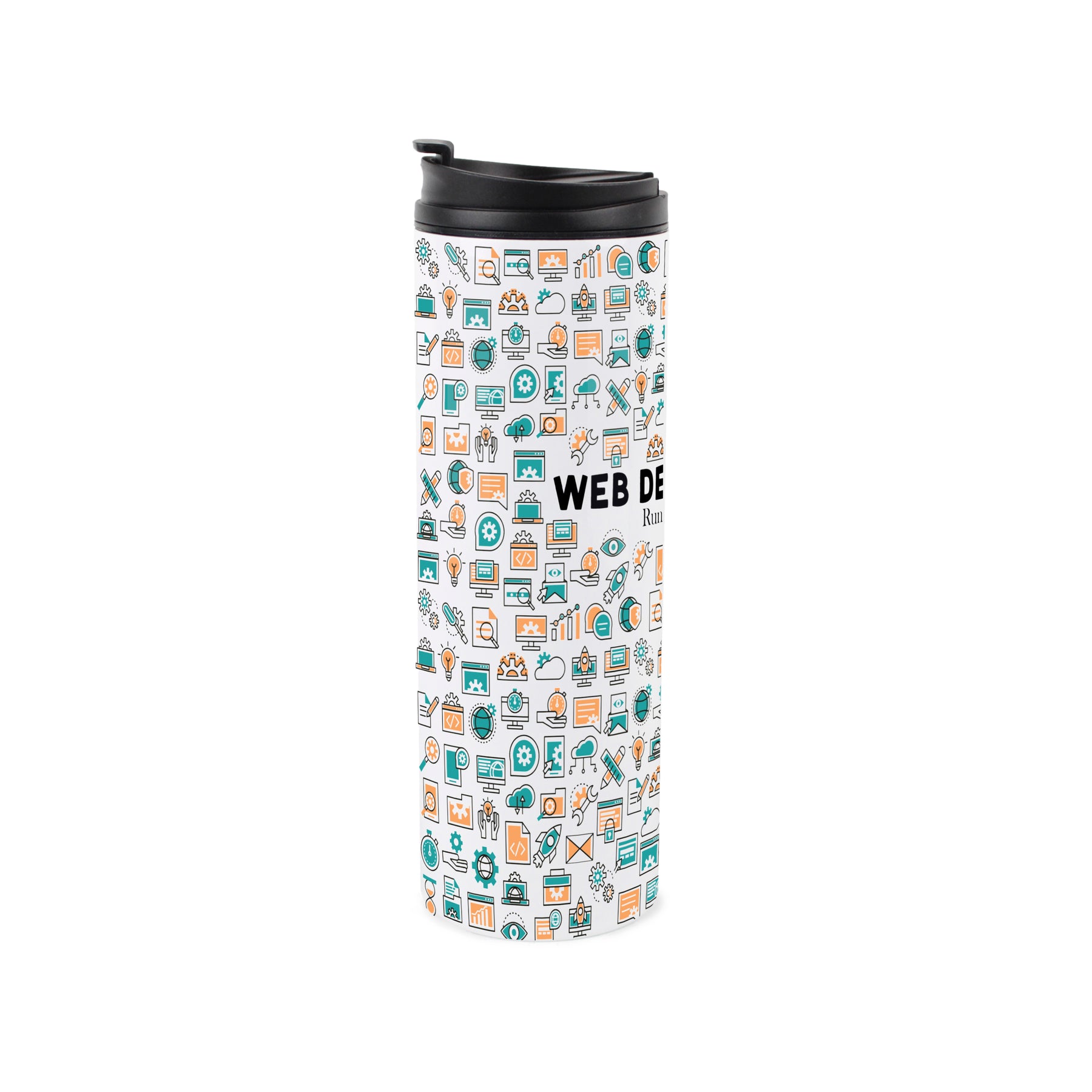This comical stainless steel travel flask is a perfect gift for any web developer in your life. Featuring a range of software and technical computing themed illustrations, with text quoting "Web Developer - Runs on Java" on the front, this will be sure to give them a chuckle during days in the office!