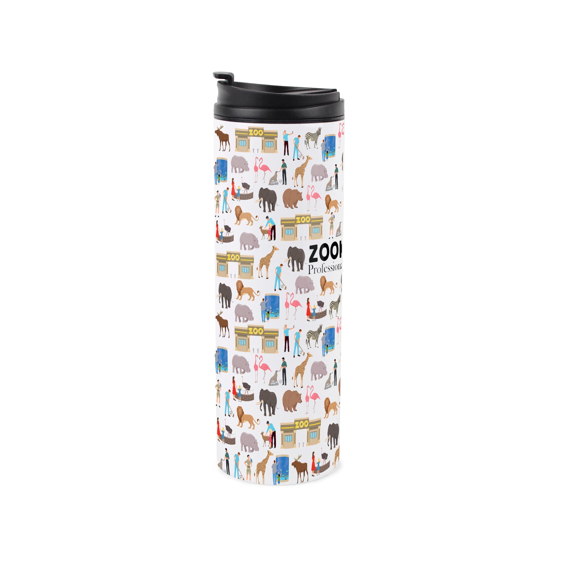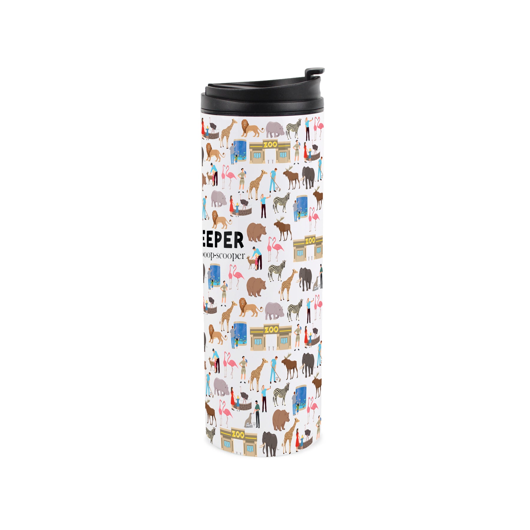 This zoo-themed stainless steel travel flask is a perfect gift for any animal keeper in your life. Featuring a fun print filled with zoo animals, zookeepers and a grand ZOO entrance around the tumbler, along with text quoting "Zookeeper - Professional poop-scooper" on the front, this will be sure to make their hot drinks taste even better, while giving them a chuckle between cleaning enclosures!
