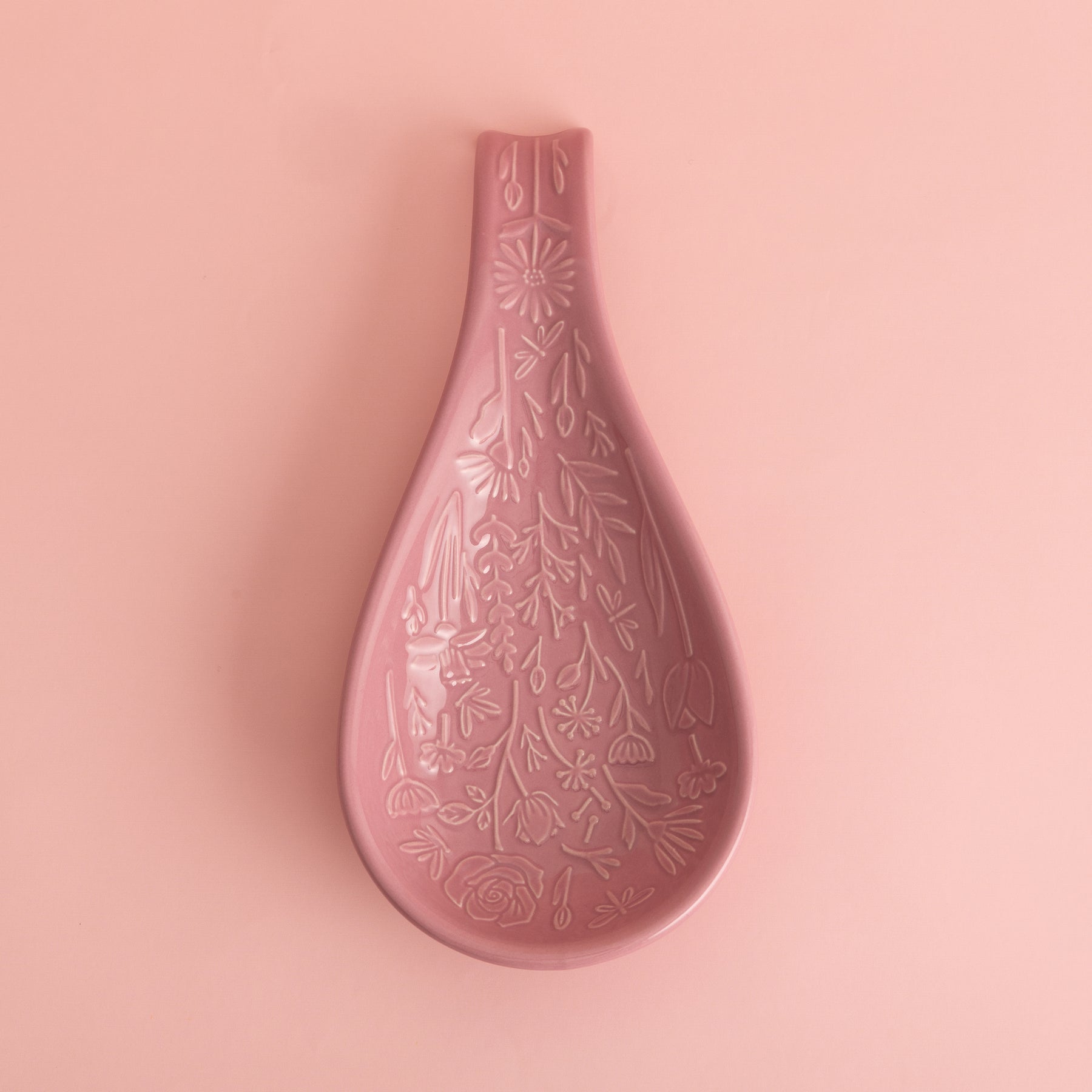 Made from durable yet fine stoneware, this spoon rest is decorated with embossed daffodils, roses and tulips - a delicate pattern that will suit any home décor. Perfect for keeping your worktops clean from sauce-covered utensils when cooking, the lovely pink colouring will add a burst of joy to your home!