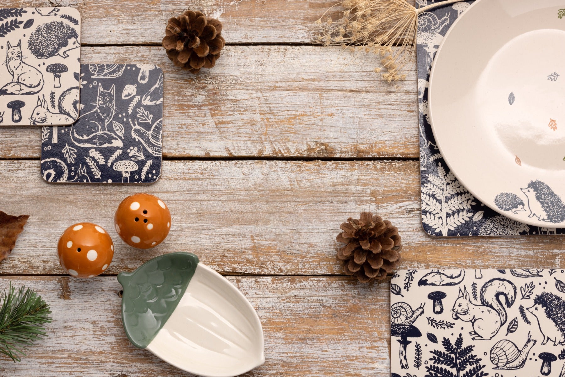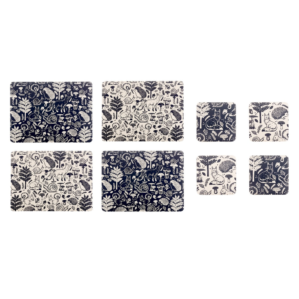 Inspired by nature, this placemat and coaster set features beautiful illustrative woodland creatures and other forest finds in two colours. This tableware set consists of four placemats and four coasters, creating an 8-piece set. Half of the set is a midnight blue colour with cream illustrations, and the other half of the set is the opposite (cream with midnight blue coloured details).