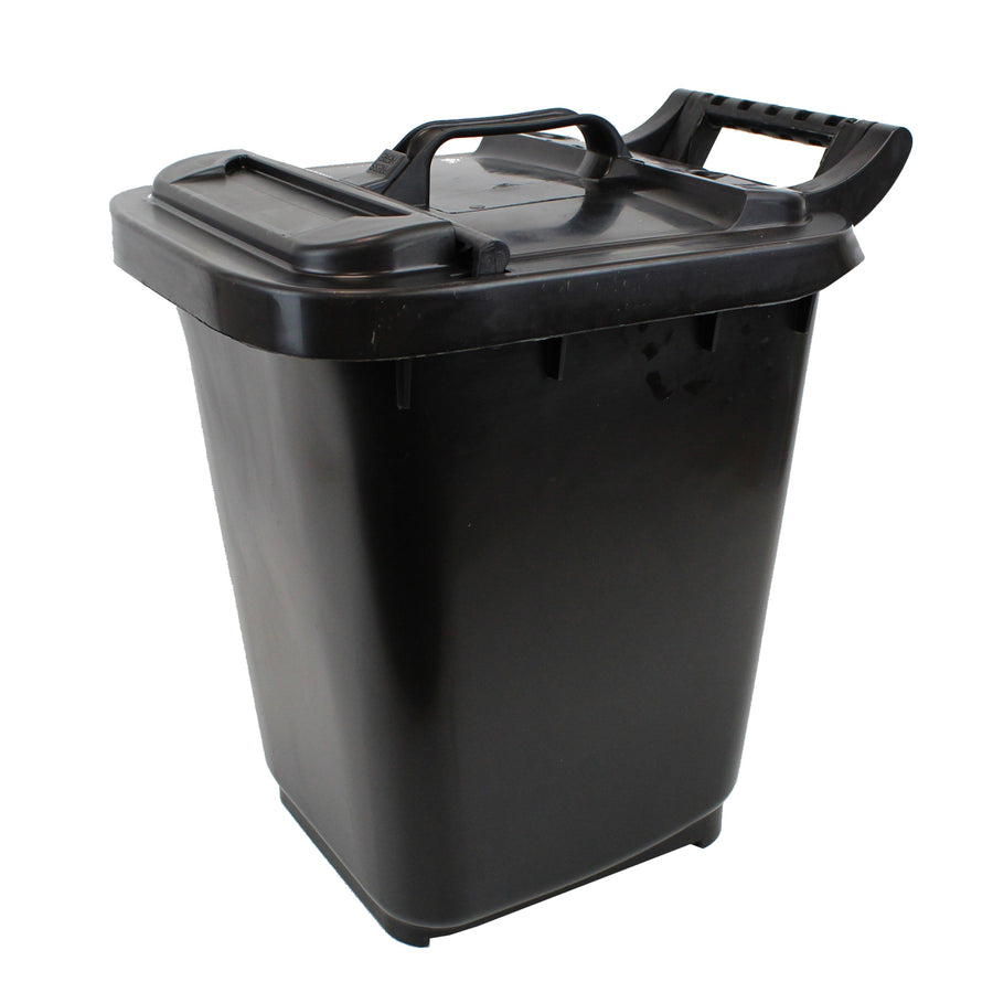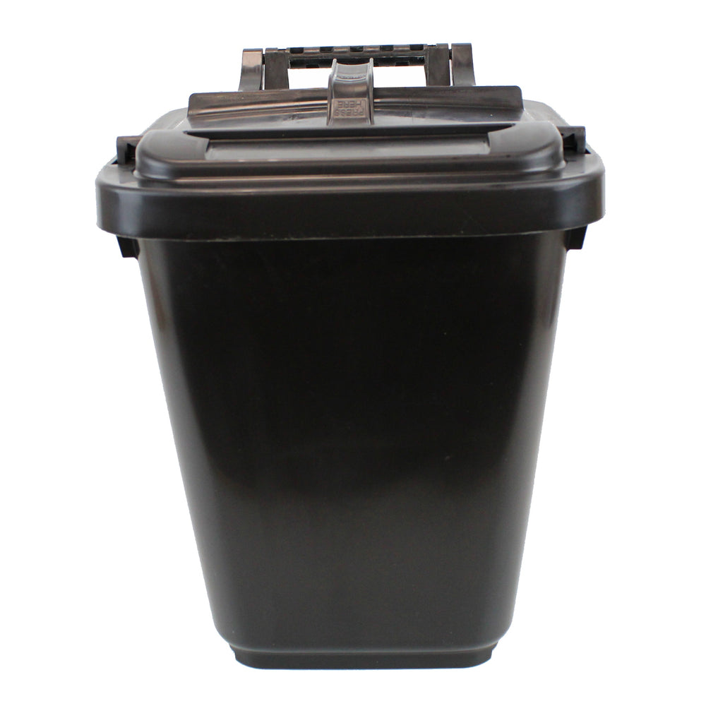 This black outdoor kerbside caddy benefits from a clever locking mechanism on the lid, that helps keep vermin out! Simply press the button on the top with your thumb to open. It has a smooth wipe-clean interior which makes it easy to keep clean. Store it in the garage, outside, or if you generate a lot of waste, you might keep it indoors too! It may be used with or without a compostable liner and the cleverly positioned handle at the back makes it easy to tip up to empty.