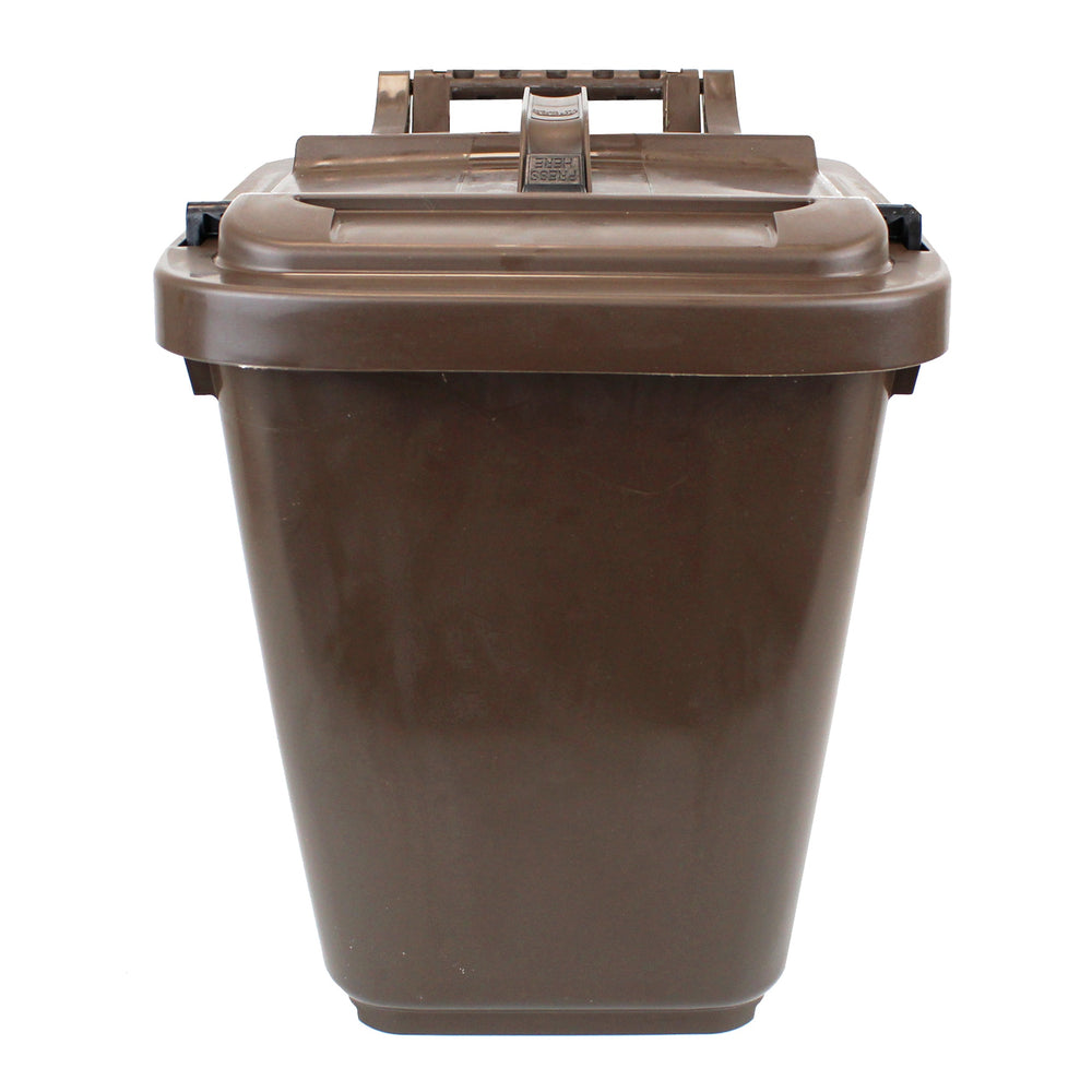 This brown outdoor kerbside caddy benefits from a clever locking mechanism on the lid, that helps keep vermin out! Simply press the black button on the top with your thumb to open. It has a smooth wipe-clean interior which makes it easy to keep clean. Store it in the garage, outside, or if you generate a lot of waste, you might keep it indoors too! It may be used with or without a compostable liner and the cleverly positioned handle at the back makes it easy to tip up to empty.