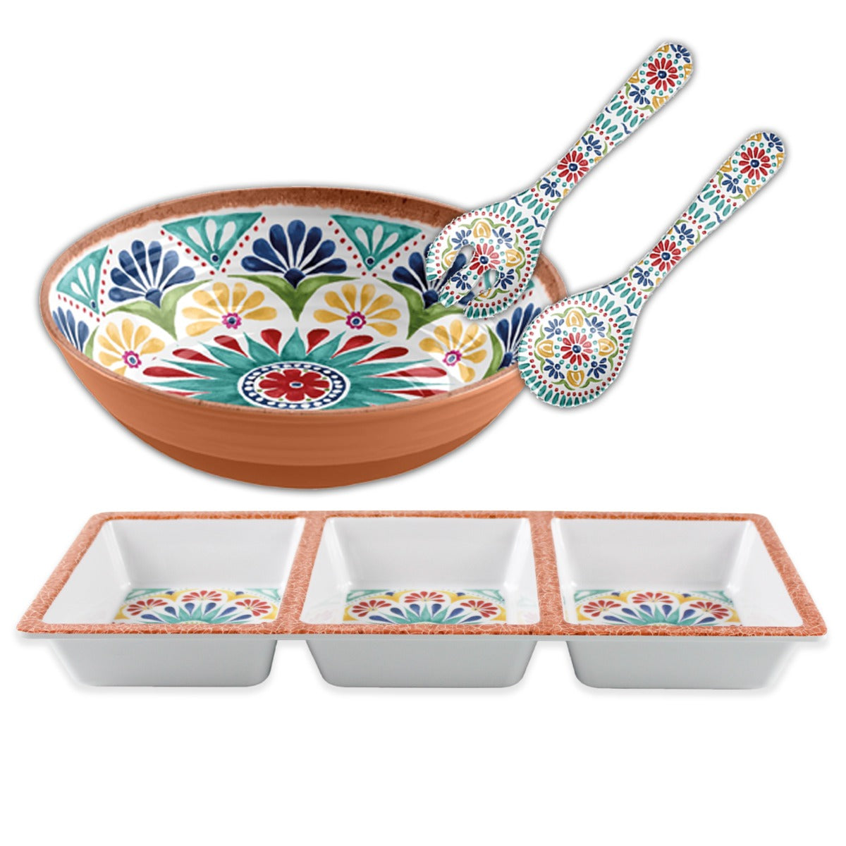 There's no need to worry anymore about serving your favourite food dishes/snacks outside and breaking your favourite, fragile serving platters. With this you can enhance your food presentation for your summer dinner party knowing they are safe! Containing a salad bowl, two servers and a 3-section tray, this set is perfect for creating a colourful and delicious summer's feast! Ideal for serving fresh salads, pastas and nibbles.