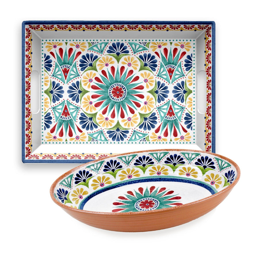 Help make your summer outdoor dining extra special with our Rio Medallion melamine. Containing an oval bowl for your delicious salads, quinoa or pasta and a large rectangular serving tray which is perfect for transporting drinks. This set is bound to catch the eye of guests and make your party stand out!