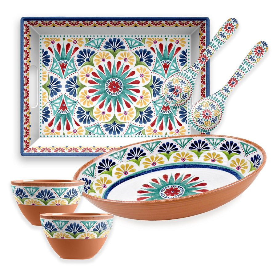 Help make your summer outdoor dining extra special with our Rio Medallion melamine. Containing an oval bowl and servers for your delicious salads, a large rectangular tray for carrying drinks, and two small dipping bowls - perfect for accompanying dressings and sauces. This set is bound to catch the eye of guests and make your party stand out!