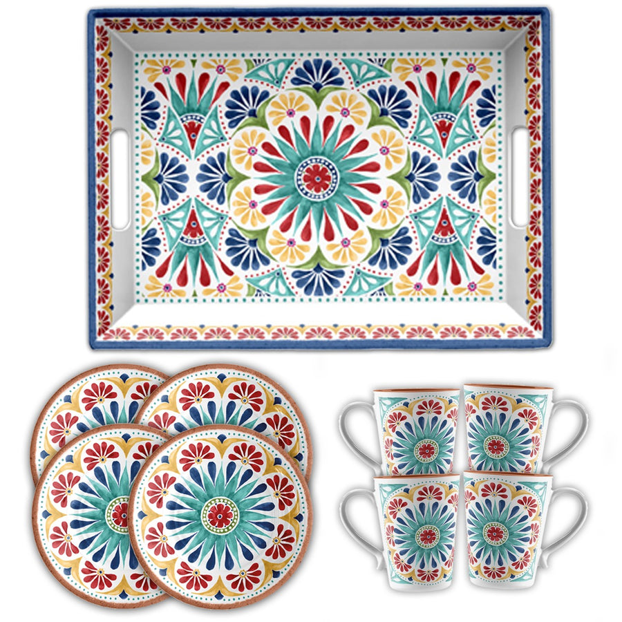 When dining outside it is always handy to have a serving tray to carry out food and drink to your friends and family. Both practical and beautiful, this Moroccan style tray is sure to stand out and bring colour to any meal time or event. With four lovely side plates and mugs to accompany it, making it the perfect afternoon tea outdoor dining set! With their ceramic like qualities and smooth finishing, these are easy to wipe clean and will be hard for you and your guests to even notice they are melamine!