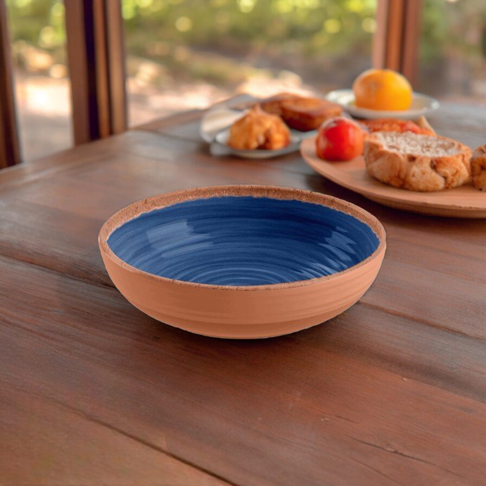 Whether you are camping, enjoying a summer morning breakfast in your garden, or hosting a dinner party, this set of beautiful indigo swirl terracotta look cereal/dessert bowls are ideal to add an earthenware, rustic aesthetic to your table. What is more, due to their rather substantial size and because they are made from durable melamine, these bowls can be used to plate salads or to serve snacks to guests.