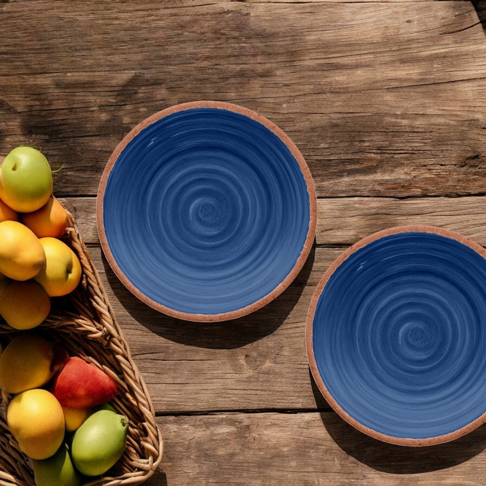 Wow your dinner guests with this beautiful indigo swirl, terracotta look dinner set. Containing dinner and side plates, this set is perfect for adding an earthenware, rustic aesthetic to your table. So, whether you are camping, enjoying a meal in your garden, or hosting a dinner party, this set is the ideal companion to your culinary plans.