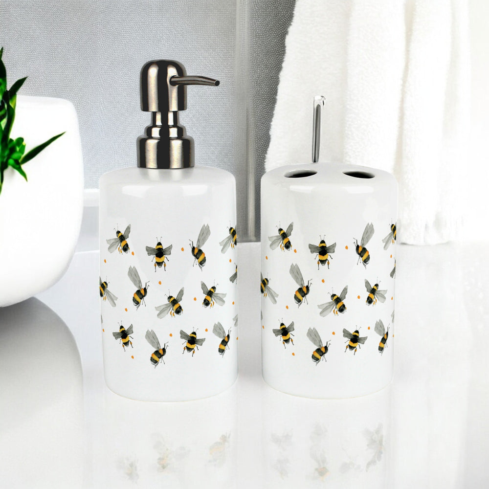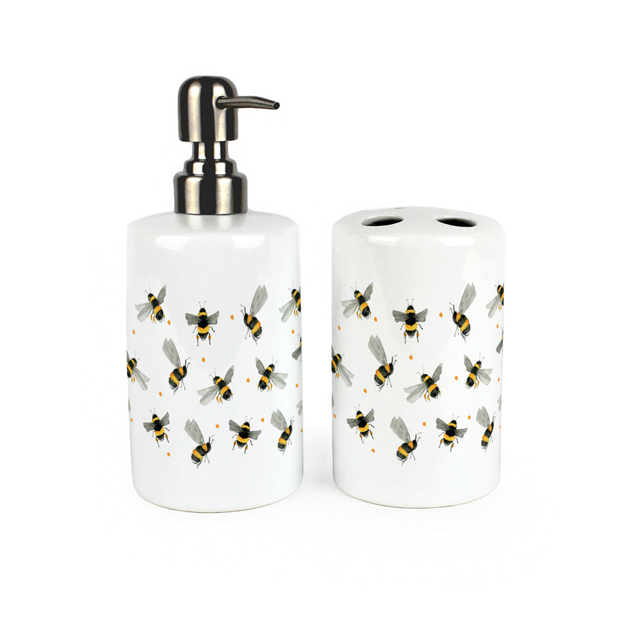 This stylish soap bottle and toothbrush holder set features a scattered bees design by artist Rhiannon Chauncey, completed with golden yellow polka dots - perfect for brightening any bathroom! A lovely gift for any new homeowners, or to refresh your own décor.
