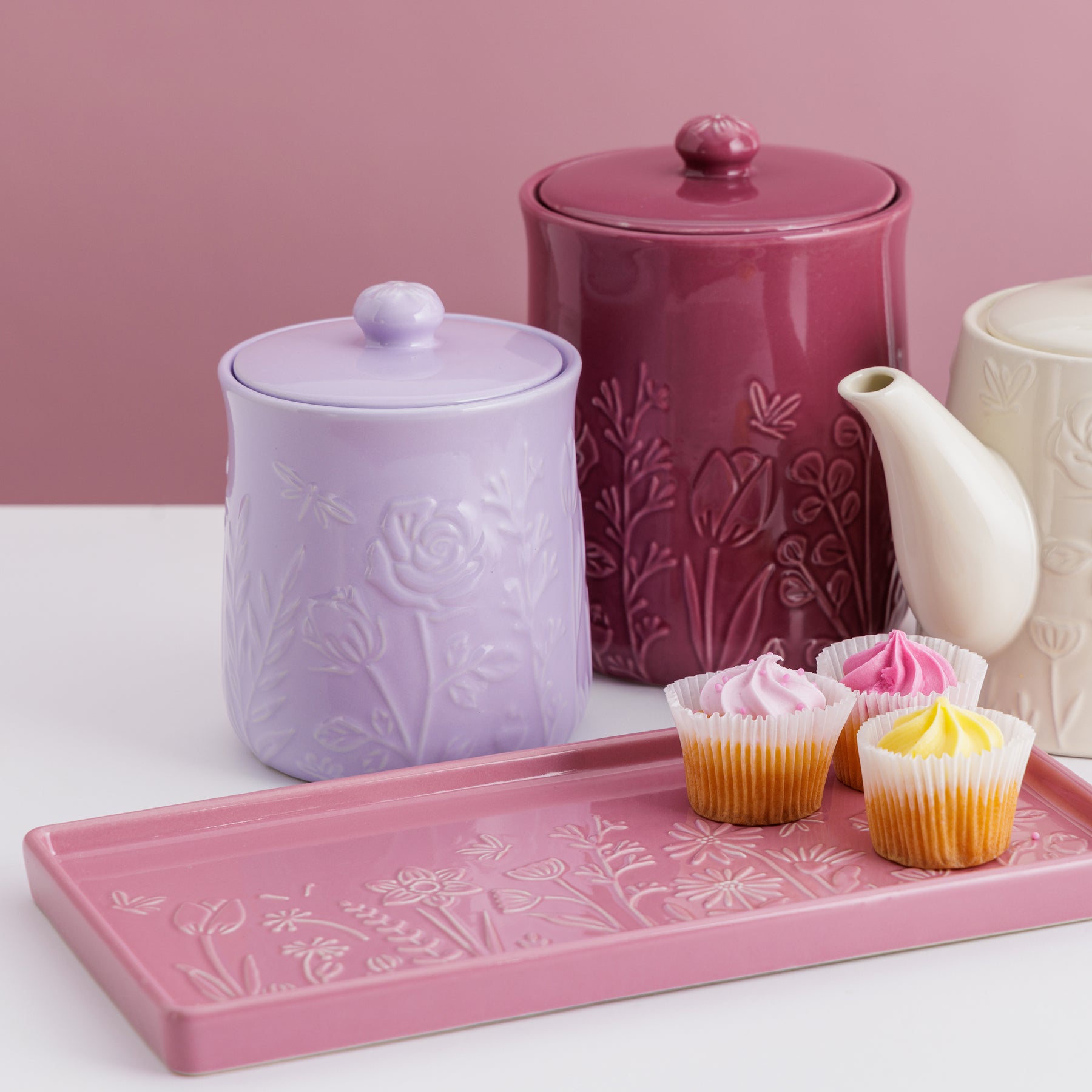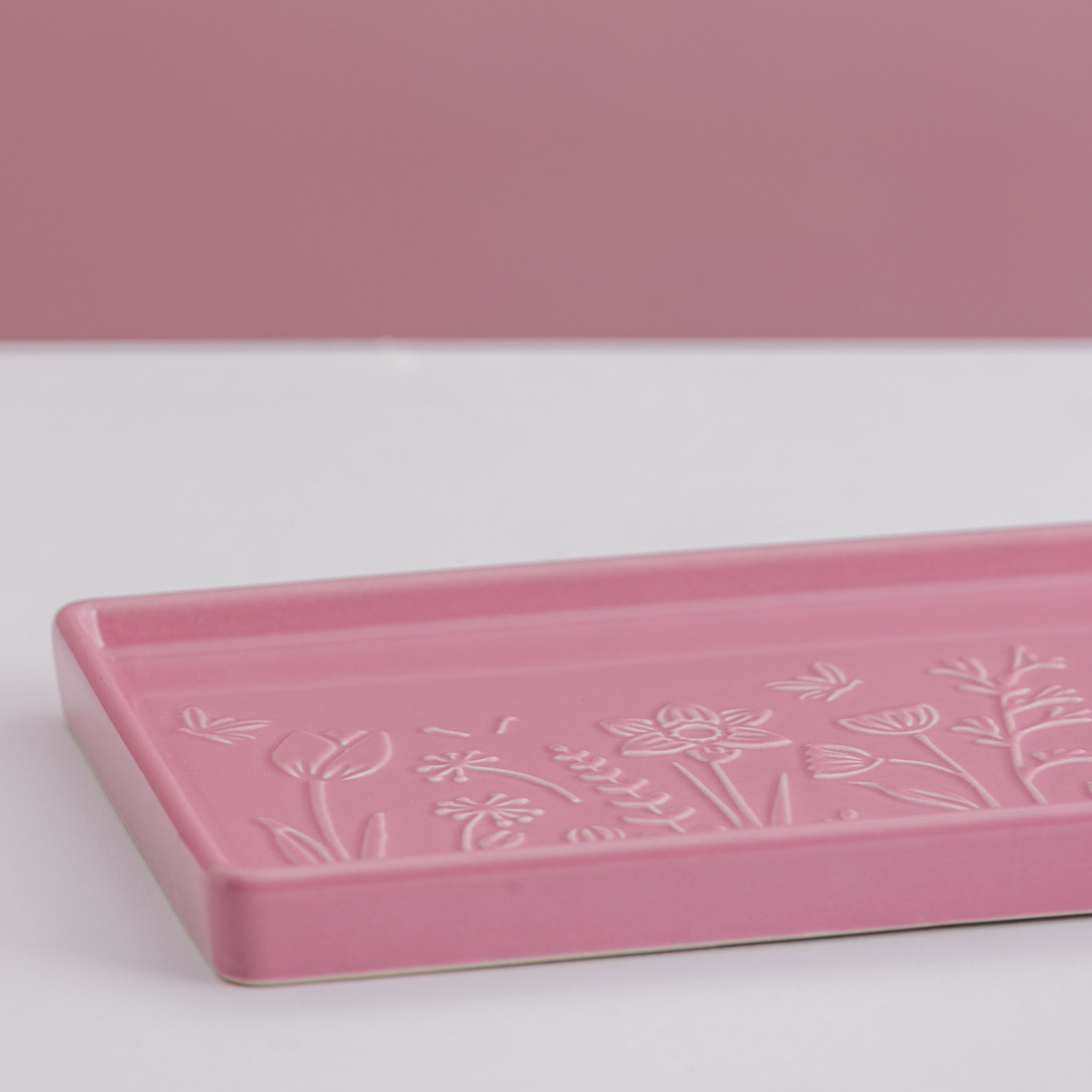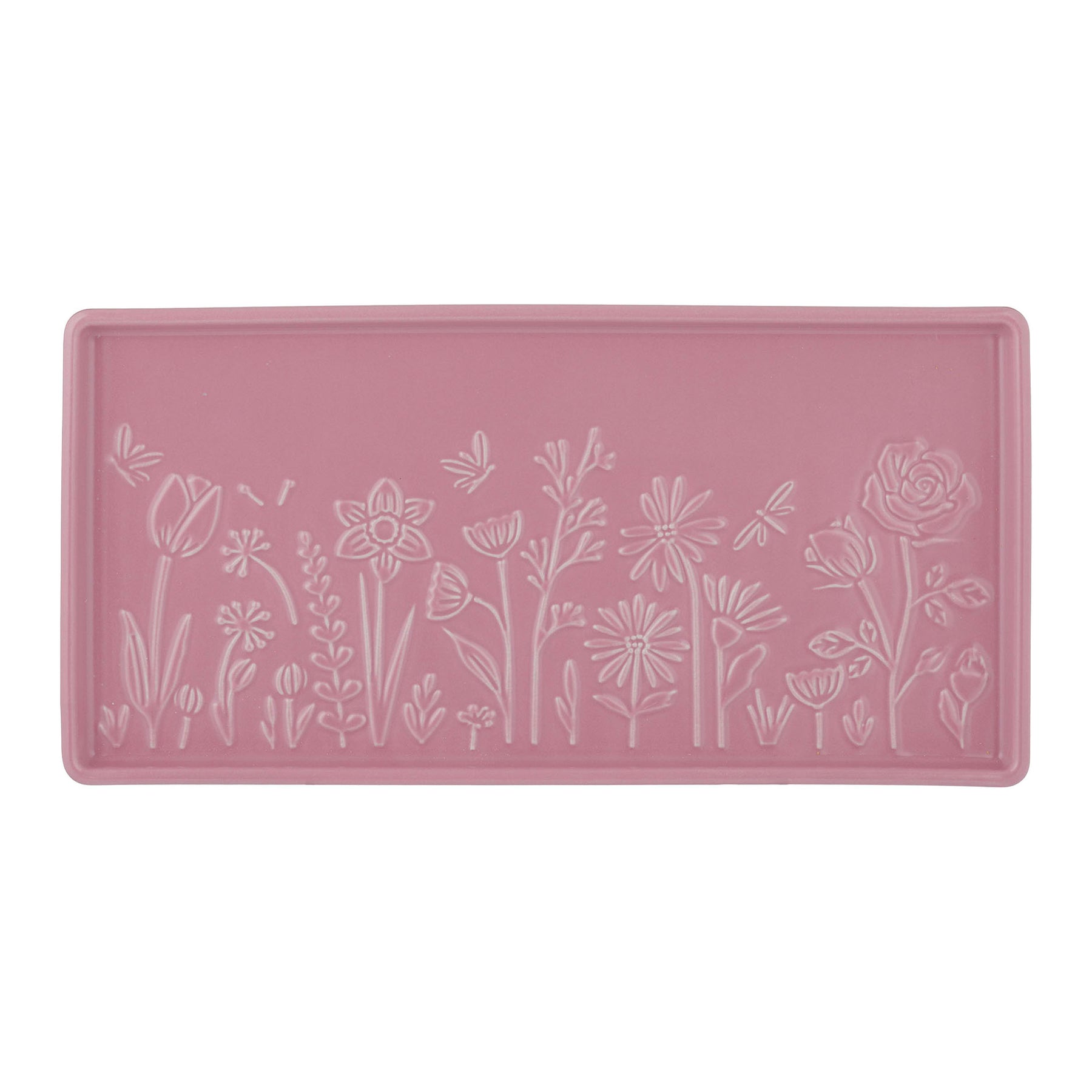 Made from durable yet fine stoneware, this rectangular tray is decorated with embossed daffodils, roses and tulips - a delicate pattern that will suit any home décor. Perfect for displaying on your table, storing trinkets or serving cakes and nibbles, the lovely pink colouring will add a burst of joy to your home, whatever you decide to use it for.