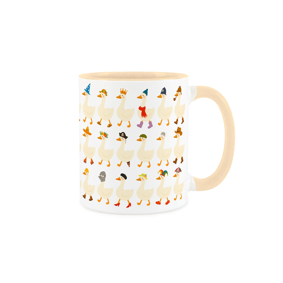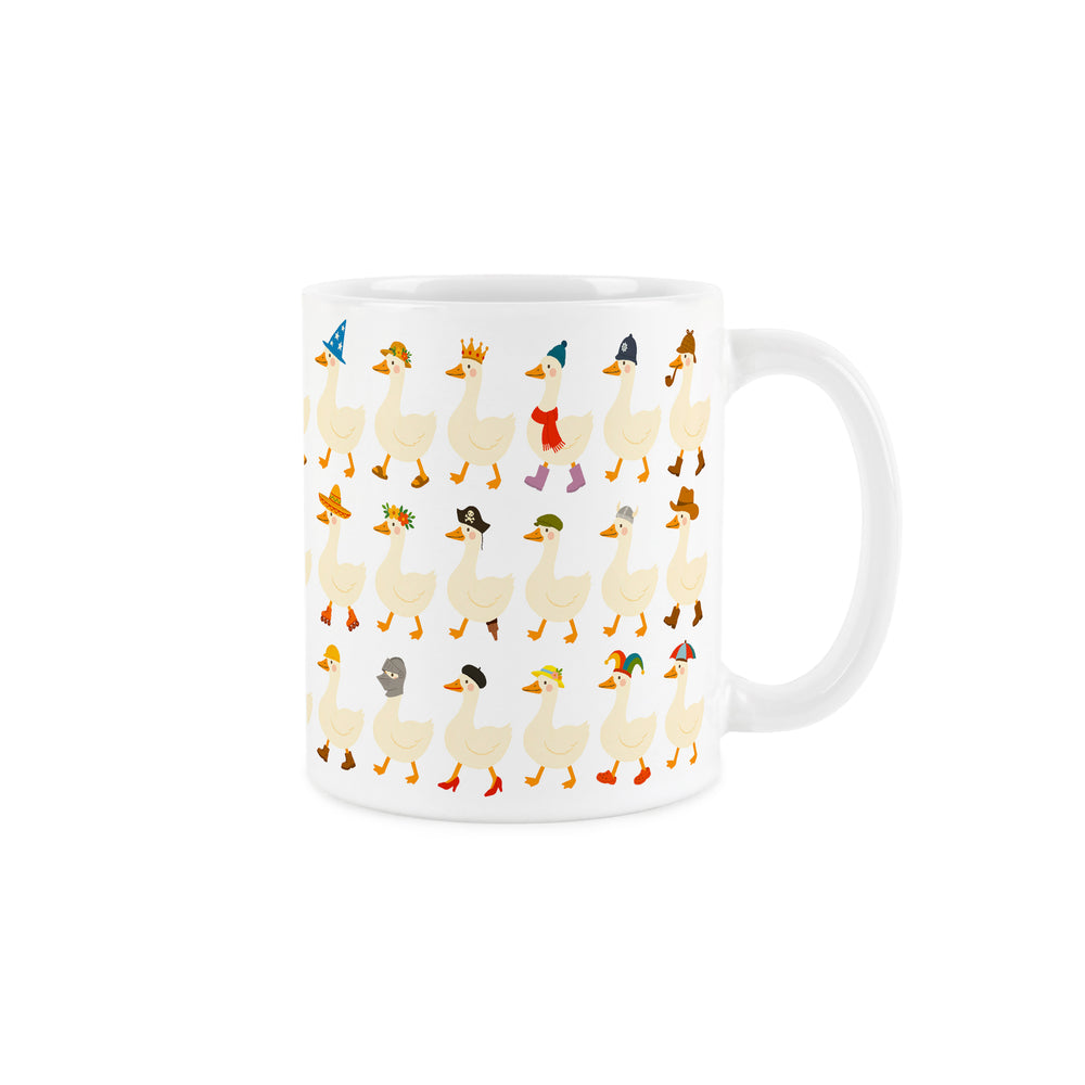 Take a gander through the world of 'Silly Goose' characters with this quirky ceramic mug! Displaying rows of geese, each dis-goose-d with different outfits and accessories, this mug is sure to create a fun conversation starter over a coffee with friends. A comical gift idea for any occasion, available on either a white or beige mug.