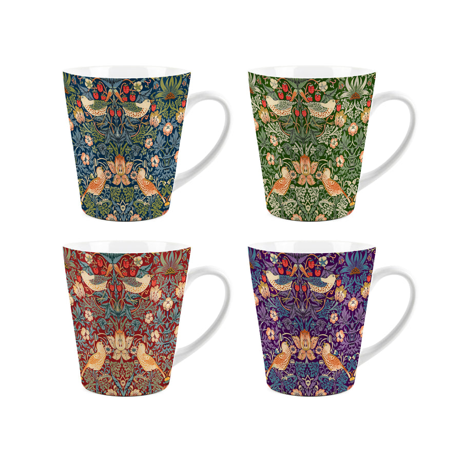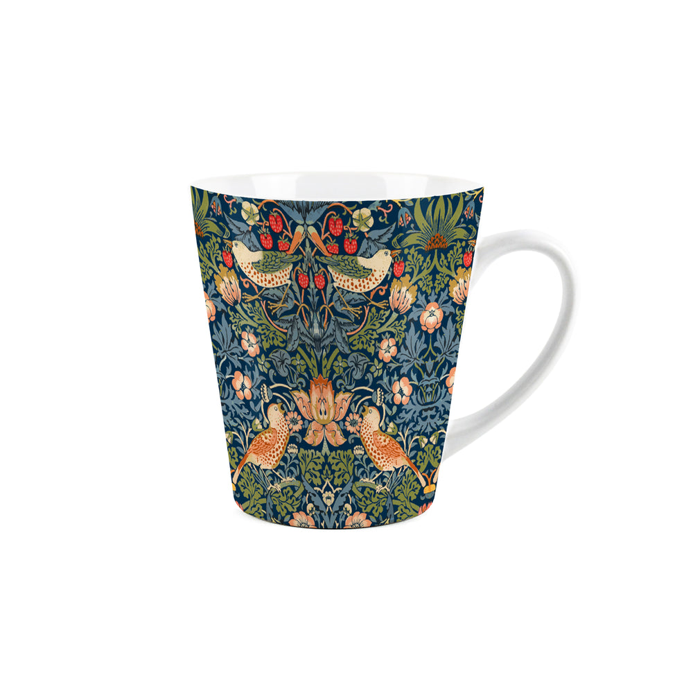This artistic latte-style mug is an unusual yet timeless gift for art lovers! Stylised on the works of famous designer William Morris, featuring a bird print surrounded by foliage and fruits on different coloured backgrounds. Perfect for enjoying a hot drink!