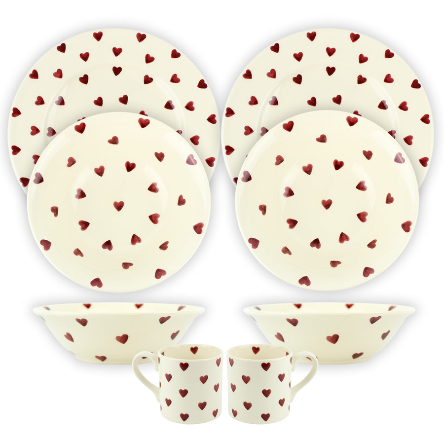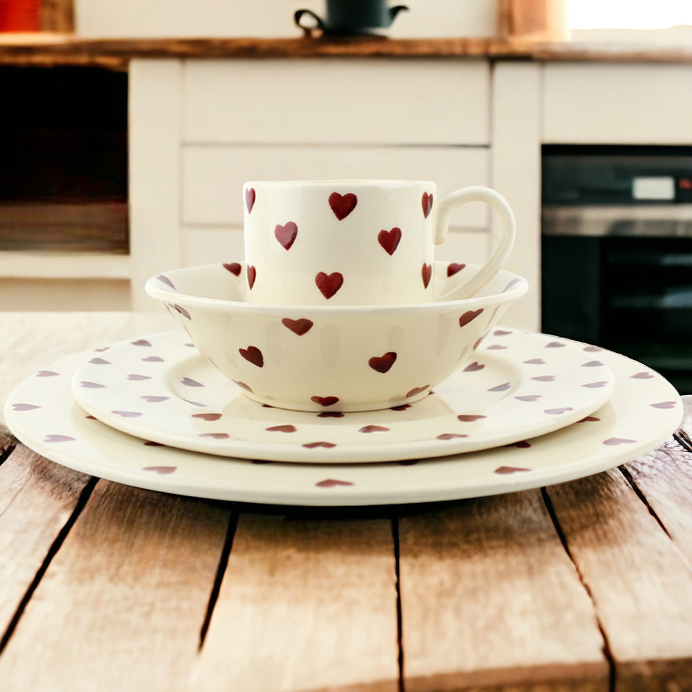 This dinnerware set made by Peregrine Pottery will bring a touch of luxury, handmade English cream ware into your home. Featuring a red heart motif design, individually hand-printed, this collection is perfect for someone who loves the quaint charm of an English Country Cottage aesthetic.