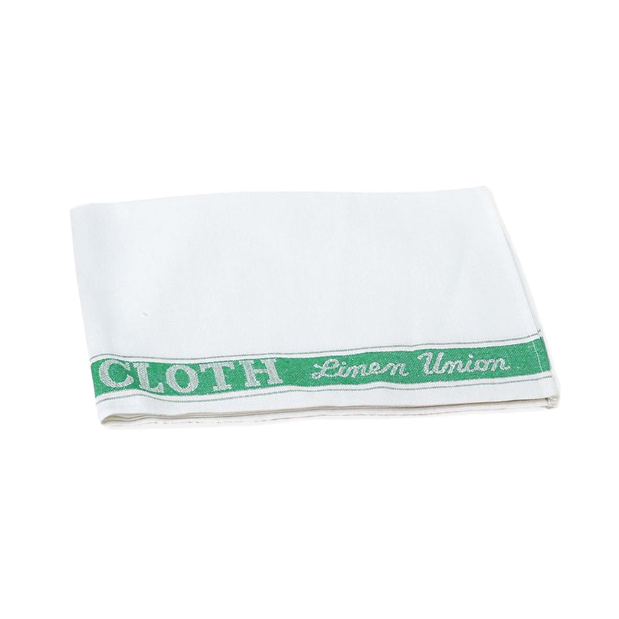 This tea towel comes with a green bordering and features the words "cloth" and "linen union" printed across it.