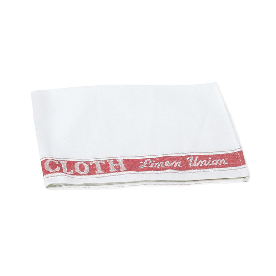 This tea towel comes with a red bordering and features the words "cloth" and "linen union" printed across it.