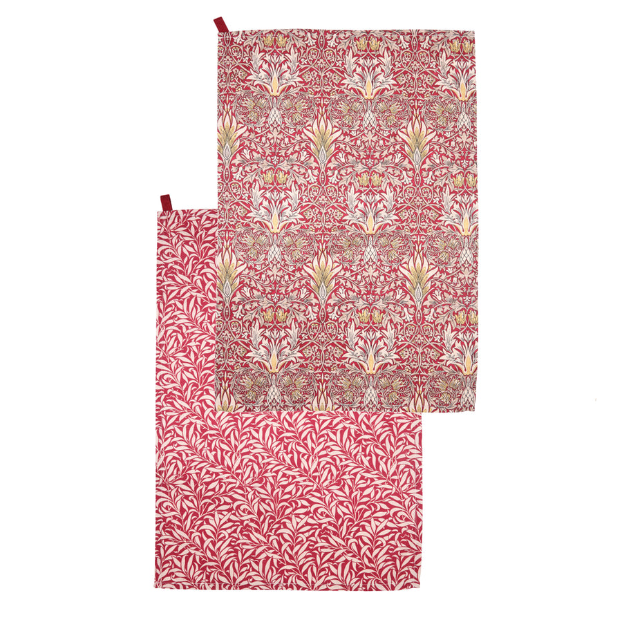 This stunning tea towel set represents the well established brand Morris & Co, inspired by the beauty of nature. Featuring a bold, bright design developed from the original branding of William Morris' company, which was founded in 1861. Capturing the authentic nature of an original Morris design, one tea towel in this set displays the well-known 'Snakeshead' design in claret red, while the second tea towel in the set showcases a complimenting foliage design.