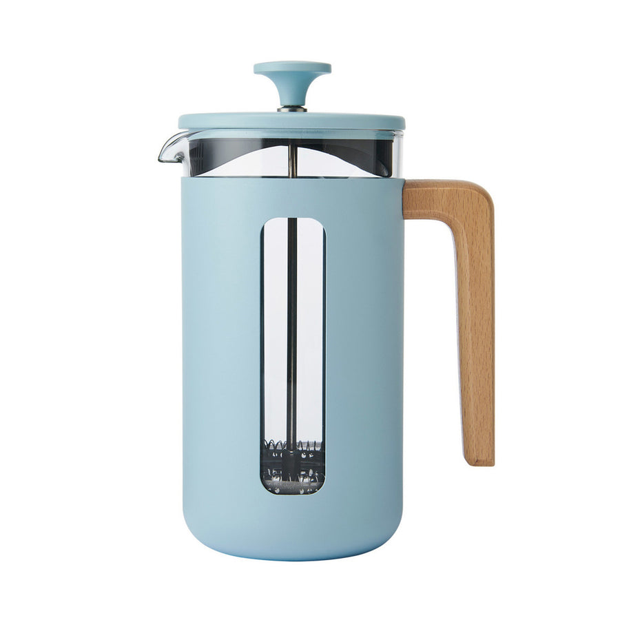 Enjoy a moment of peace & quiet with a deliciously rich coffee made in this stunning pale blue cafetiere. Made from rust-resistant stainless steel and shock-resistant borosilicate glass with a beechwood handle, this cafetiere has an '8-cup' (1L) capacity, a fine mesh filter and an easy pouring lip.