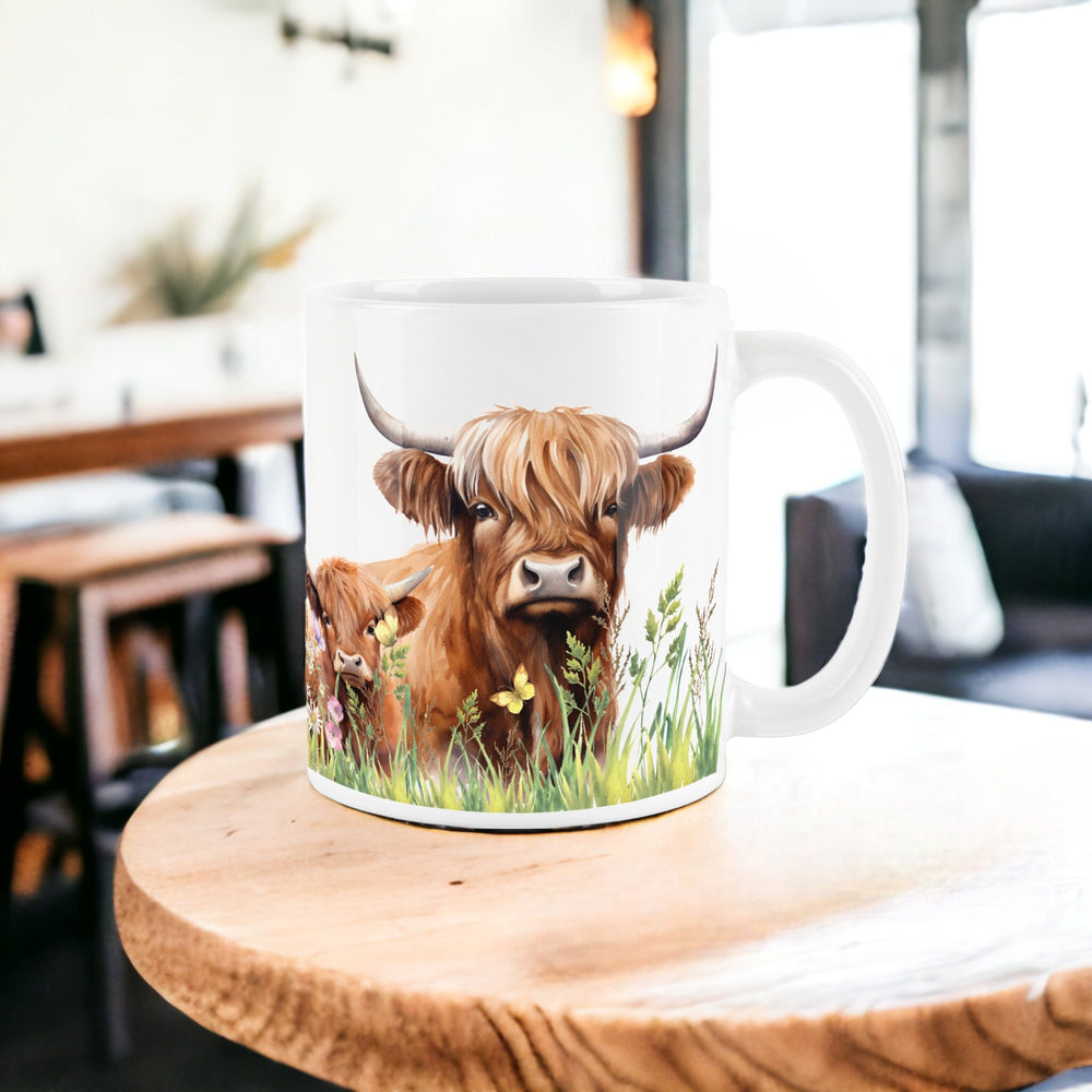 Are you an animal lover? This cute mug features an adorable highland cow & its calf, playing in a meadow. A lovely gift for friends, family or yourself!