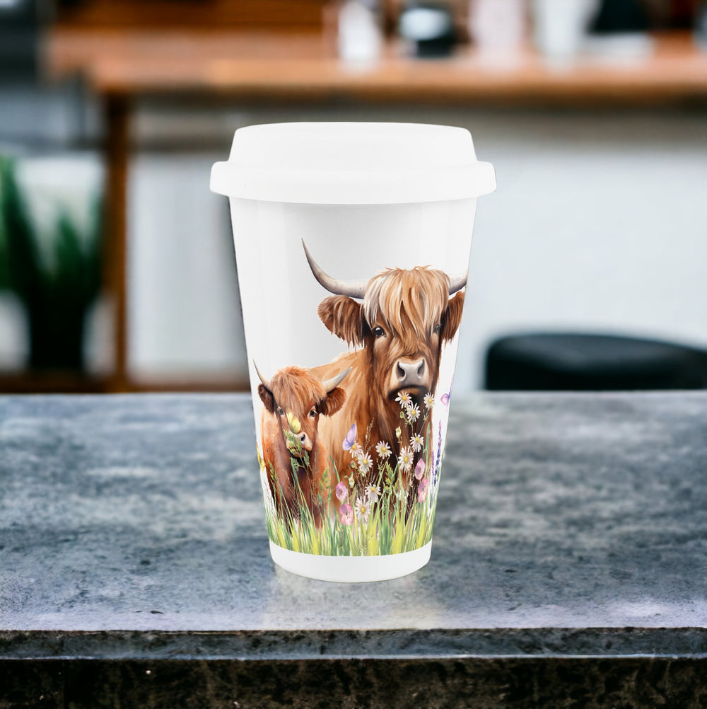 Are you an animal lover? This cute ceramic travel mug features an adorable highland cow and its calf, playing in a floral meadow. A lovely gift for friends, family or yourself!