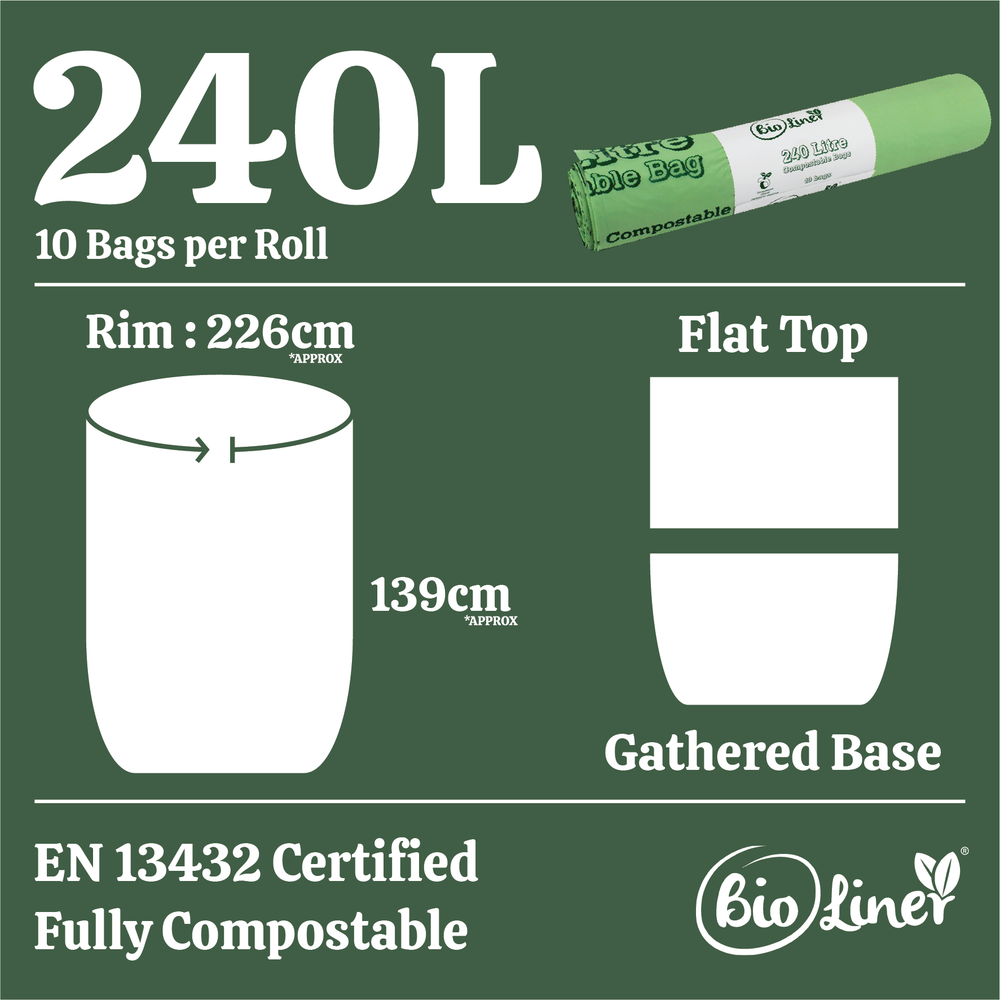 Environmentally friendly, fully compostable (EN13432) and biodegradable, BioLiner brand bags are the perfect fit! Supplied in rolls of 10 bags which are made especially for large 240L wheelie bins, they are completely environmentally friendly so suitable for both food and general waste. These bags feature a "star-sealed" base, whereby the base of the bag is gathered and sealed in such a way as to provide extra strength. This helps to prevent the bag breaking when full of waste, but does not affect the overall capacity of the bag.