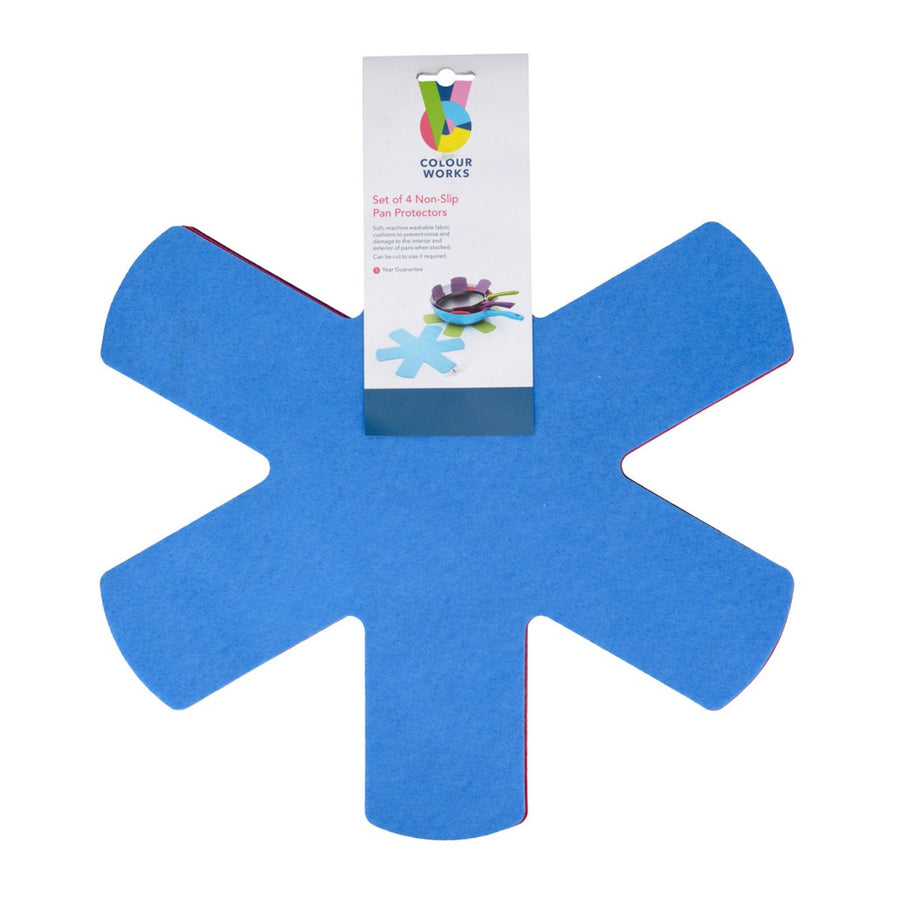 Suitable for all types of pans and woks, this set of soft, machine washable fabric pan protectors are the ideal solution to preventing your cookware from being scratched or scuffed when they are stacked or stored away. The assorted set includes four different coloured pan protectors; red, lime green, blue and purple.