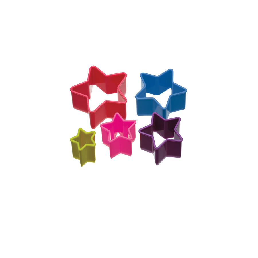 Prepare gorgeous treats for your kids, parties or just to make an ordinary day a celebration with this set of five star shaped cookie cutters. Sure to brighten any day of baking as they come in a vibrant set of primary colours!