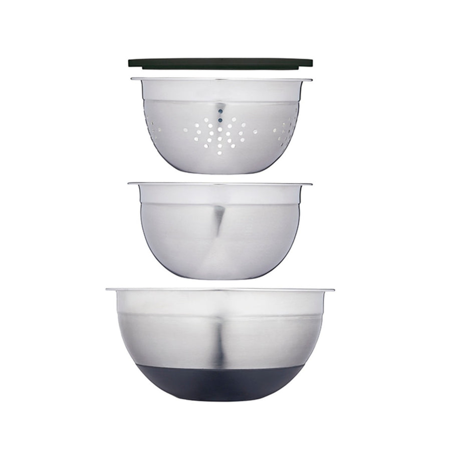 No need to compromise your cooking methods due to lack of storage space with this set of stainless steel nesting bowls! Including a large mixing bowl, a colander and a smaller lidded mixing bowl, each piece in this set is a practical item you would use regularly. Their clever design means they can stack inside one another so that they only take up the space of one bowl in your cupboard. An additional feature to the large mixing bowl is that it has a non-slip base - your worries of the bowl sliding off the counter-top while you are busy mixing will be no more!