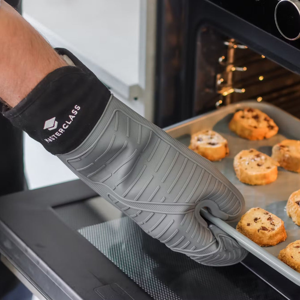 Protect yourself from hot trays, pans and dishes with this MasterClass oven gauntlet. Made from LFGB-grade silicone, with a seamless design and an extra-long cuff to keep your wrists safe, this oven glove is heat-resistant up to 250°C (482°F) and waterproof - ideal for protecting against steam, water splashes and oil spatters.